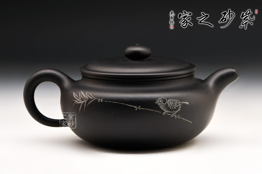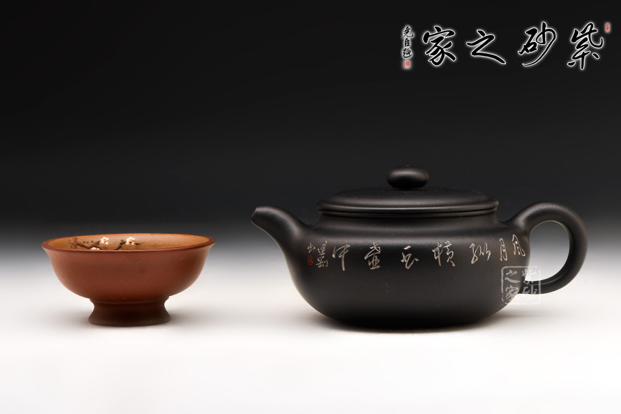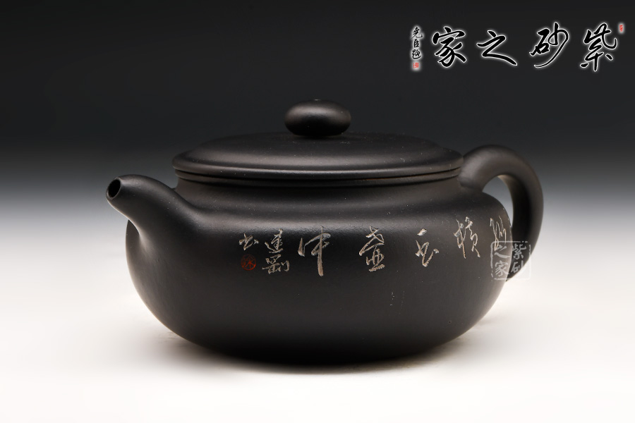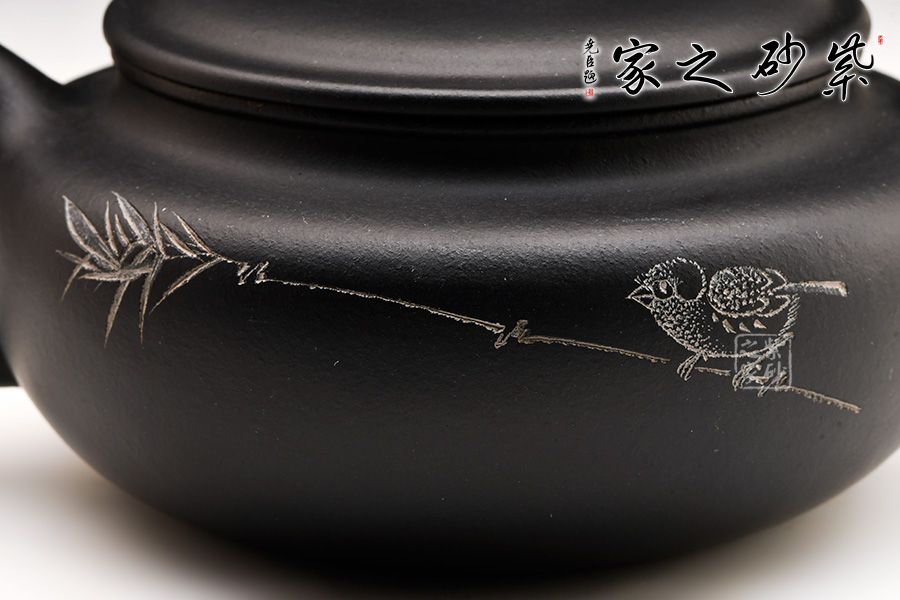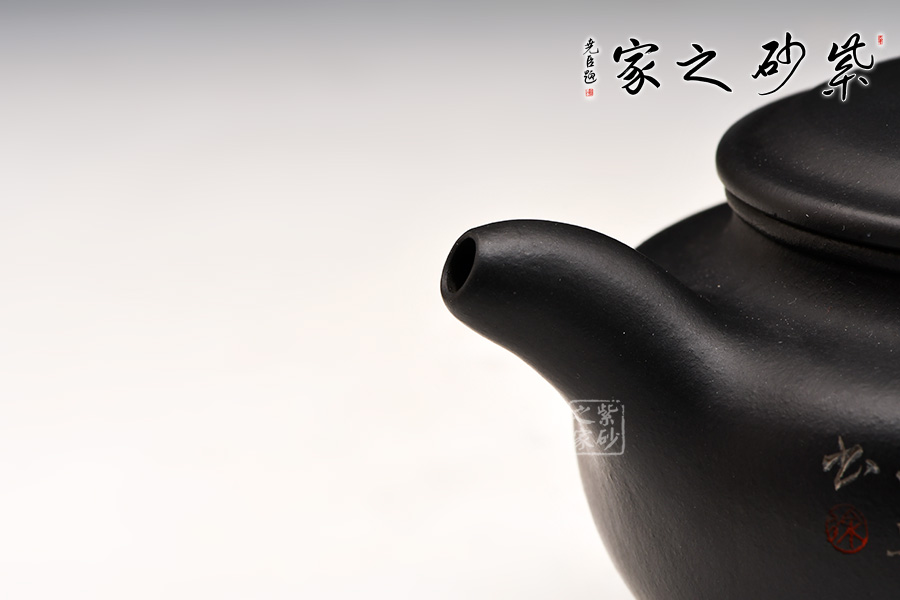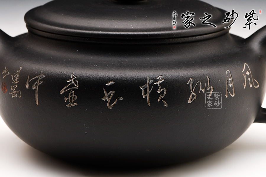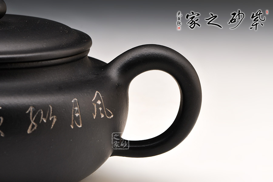 一彎流,耳形把,壓蓋與壺口嚴(yán)絲合縫,整壺做工細(xì)膩,技藝出眾,壺身刻繪更為此壺增添了文人氣息。