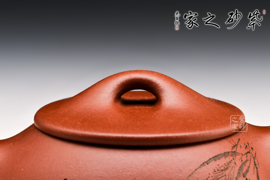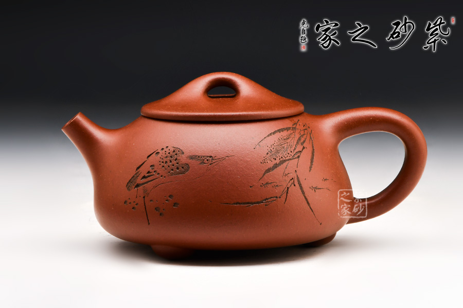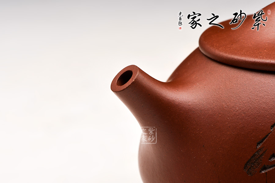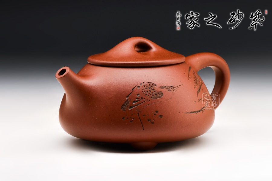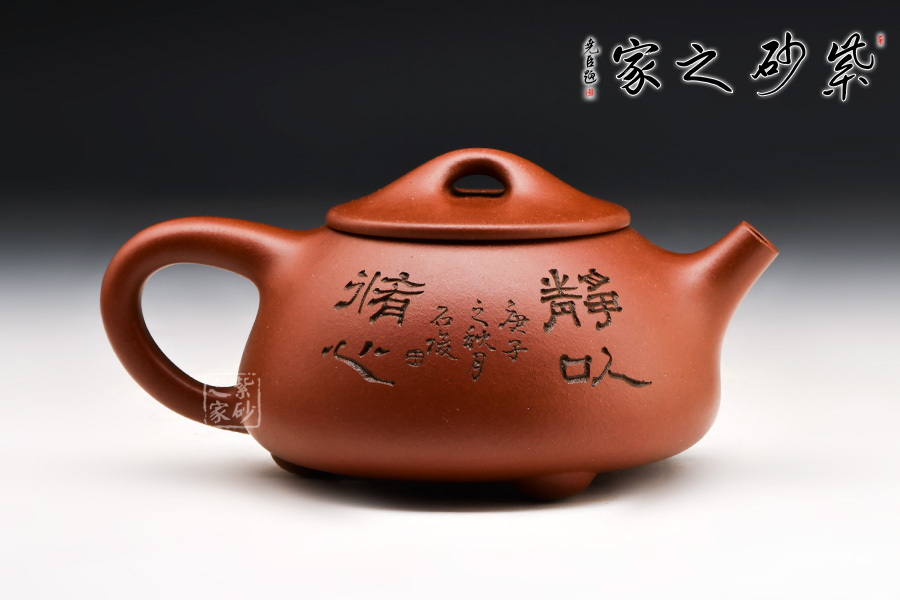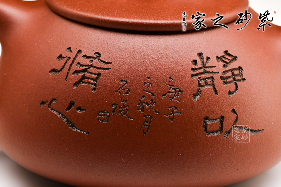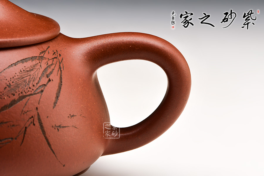 此壺為經(jīng)典的石瓢壺型,壺身近似三角形,形態(tài)雅致,端莊穩(wěn)重,柔中帶剛;直流嘴自壺身胥出,挺括有力,出水沖勁十足;暗接三角形端把剛毅有力,便于抓握;壺底三足穩(wěn)重鼎立;口蓋較薄,橋型鈕增添了幾分雅致。