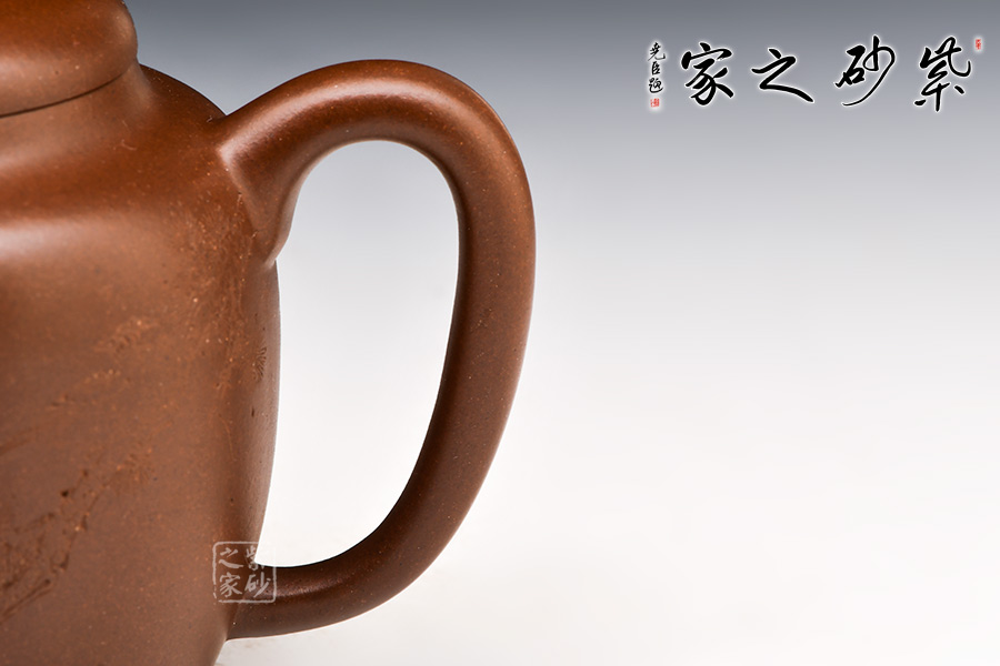 落在此壺上,可見除卻直筒壺身、直流壺嘴,此壺的端把為柔和耳狀曲線,鈕為圓形鈕,中和了此壺的硬朗感,使其氣度外柔內(nèi)剛,剛?cè)岵?/span>
