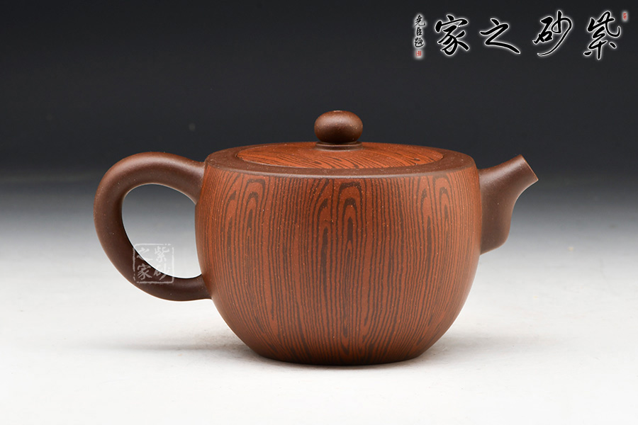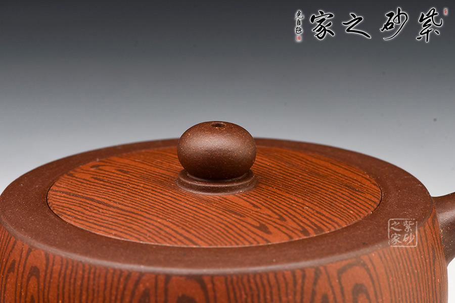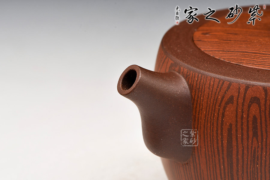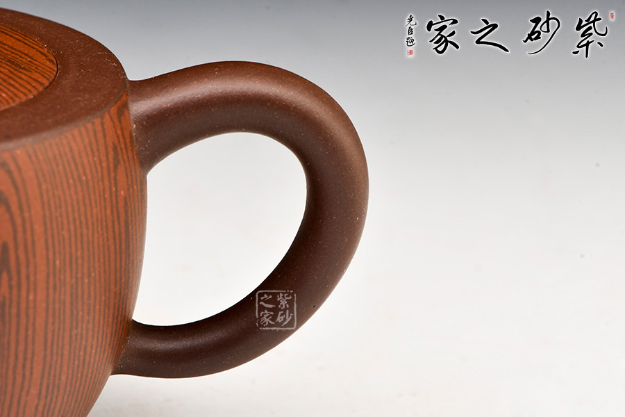 此壺壺身圓潤,似半圓中劈兩半,切口為肩、蓋,圓珠鈕亭立蓋面。壺嘴粗出細收,弧度流暢,出水爽利;壺把彎曲有致,有外擴之勢。
