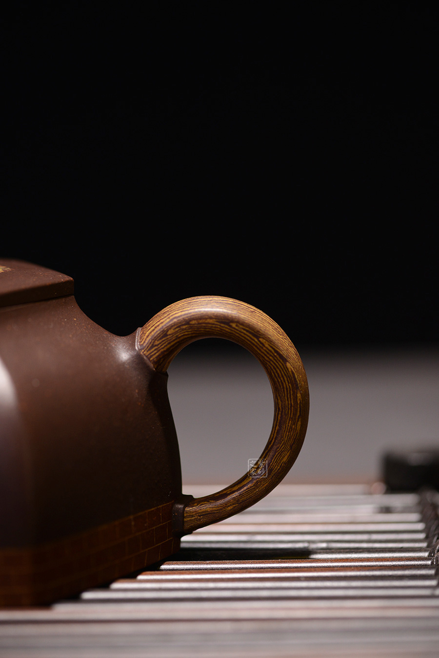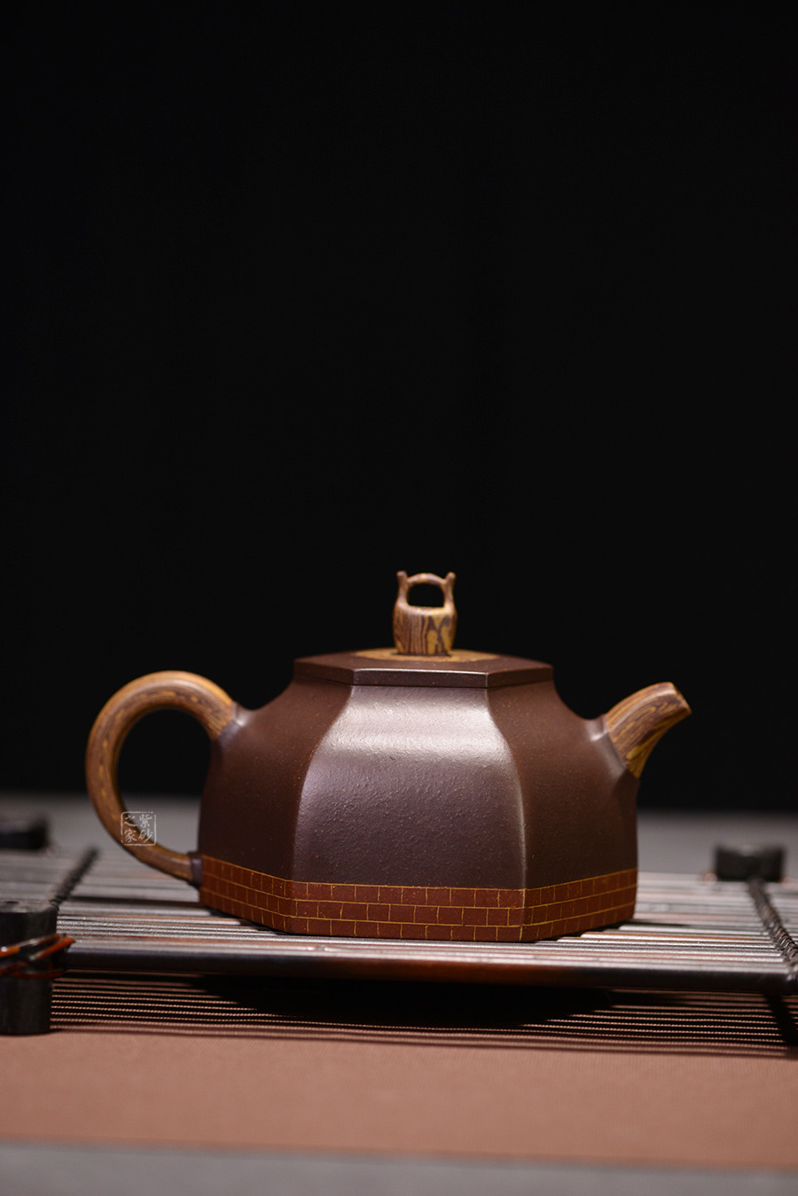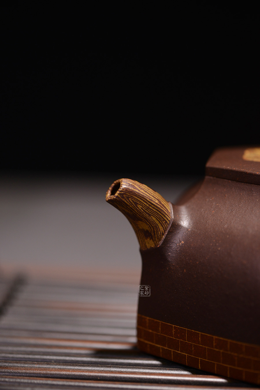 周伯娟老師的“秘色絞泥技法”在《思源壺》中大放異彩。壺足處有貼片絞泥飾磚紋,紅黃相間、排列整齊,“磚塊”與“井壁”殊無間隙,嚴絲合縫;壺流、壺把、壺鈕采用層疊法絞出木紋,層次清晰分明、紋理逼真自然;壺蓋上的絞泥則如小桶在井中蕩起的水紋,輕漾微瀾,靈動活潑。