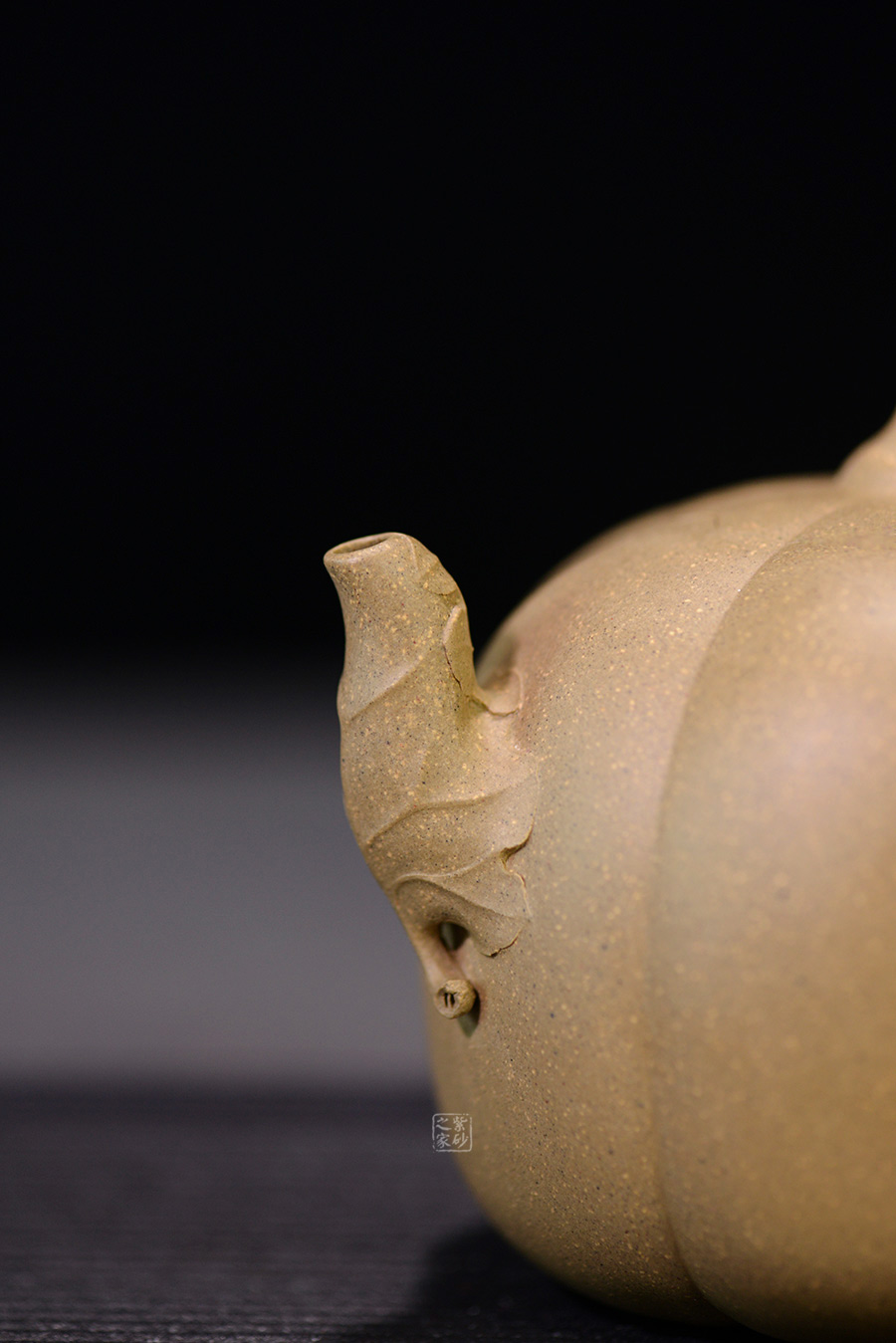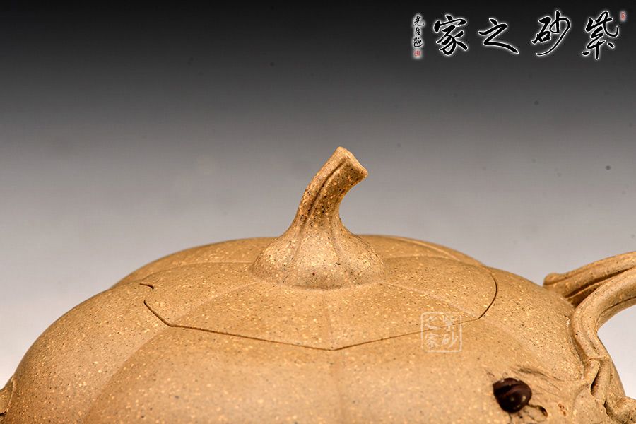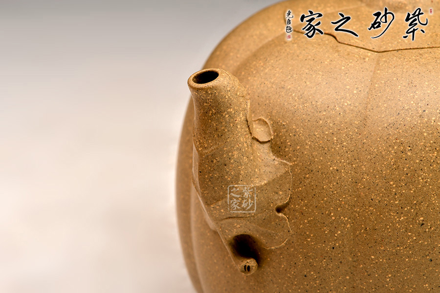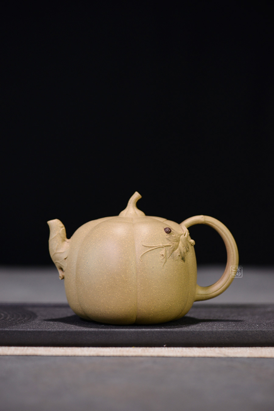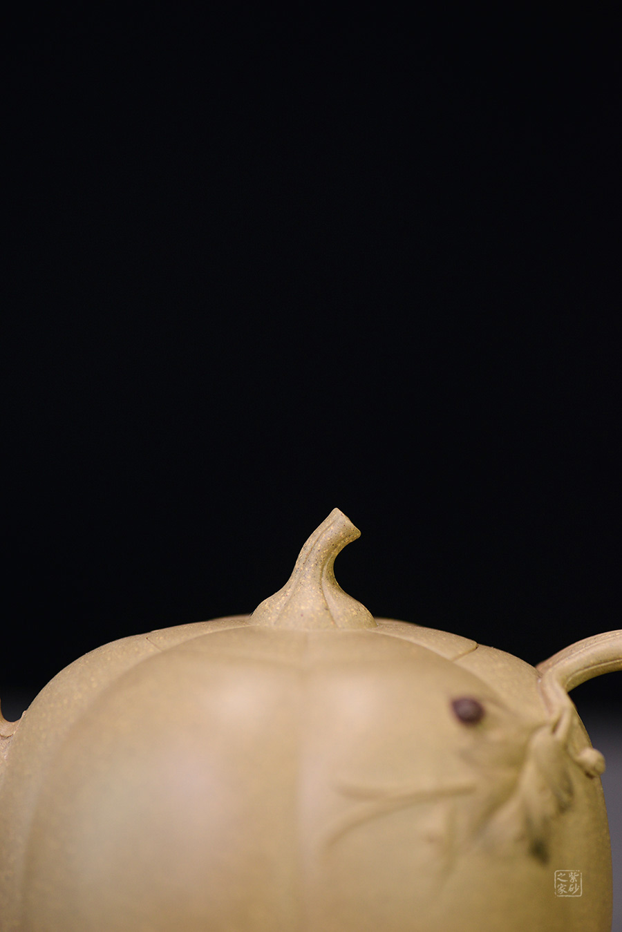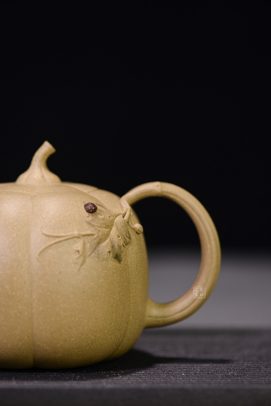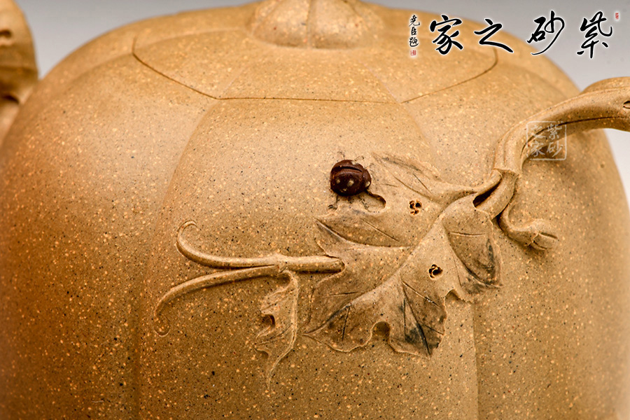 南瓜壺是紫砂壺中很常見的一種款型。此南瓜不僅外形酷似南瓜,更是集聚了南瓜的神韻,猶若瓜熟即將待落。壺鈕、壺把嫉皆以南瓜藤為原型,形象逼真。壺嘴則若南瓜葉包裹而成,精巧別致,創(chuàng)意極新。壺把處一南瓜藤胥出,藤上瓜葉、瓜仔靈氣十足。更妙在于一只瓢蟲正趴在瓜葉上,增添無限情趣,大自然氣息濃郁。