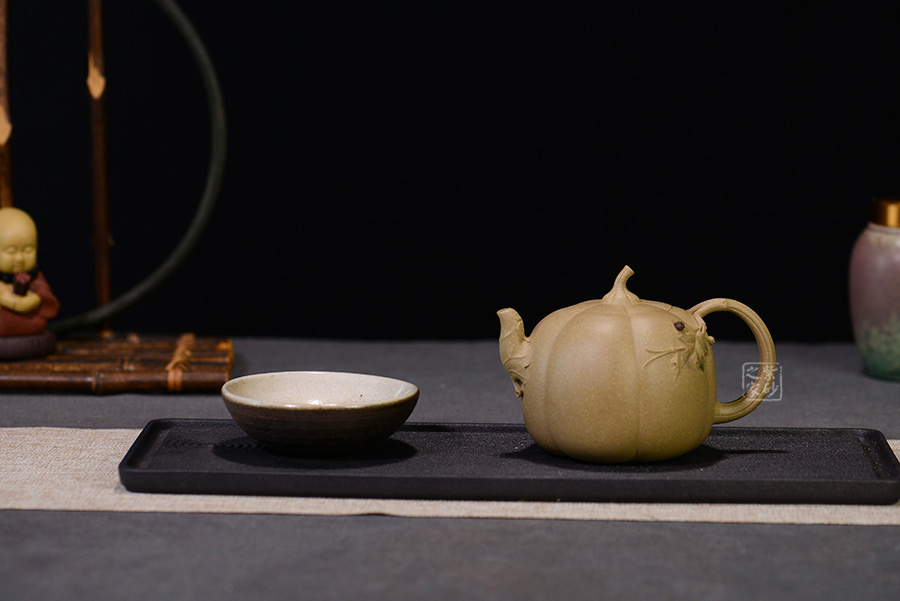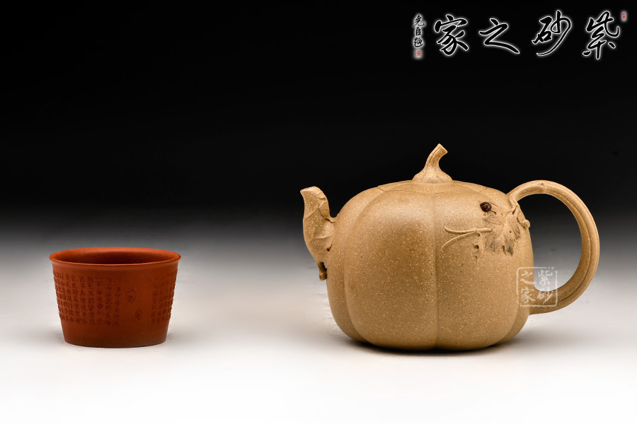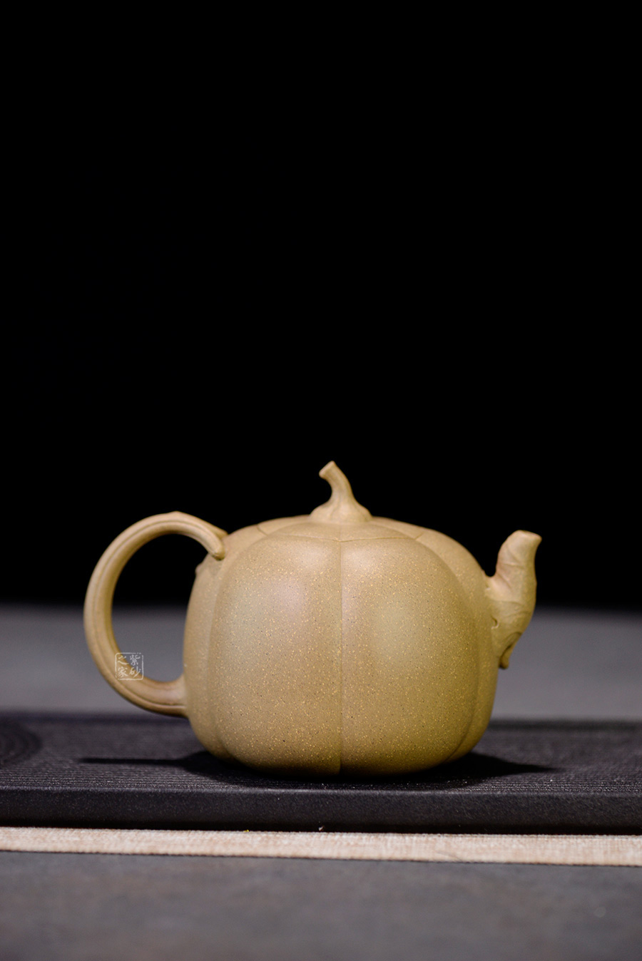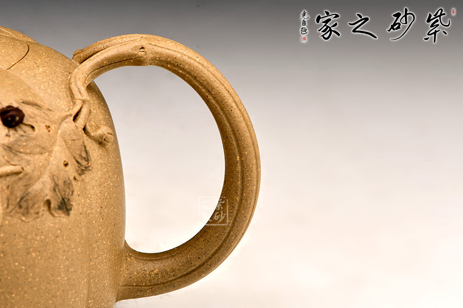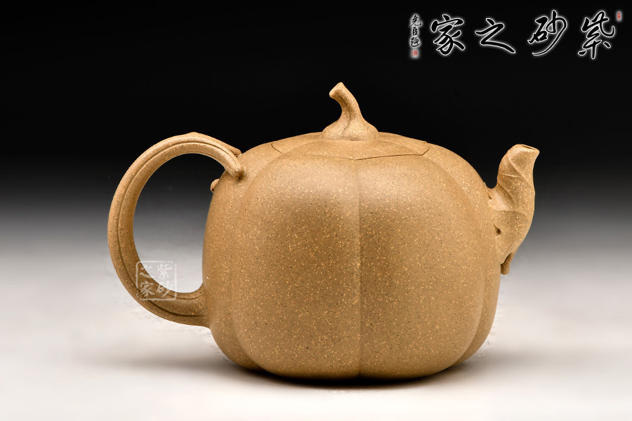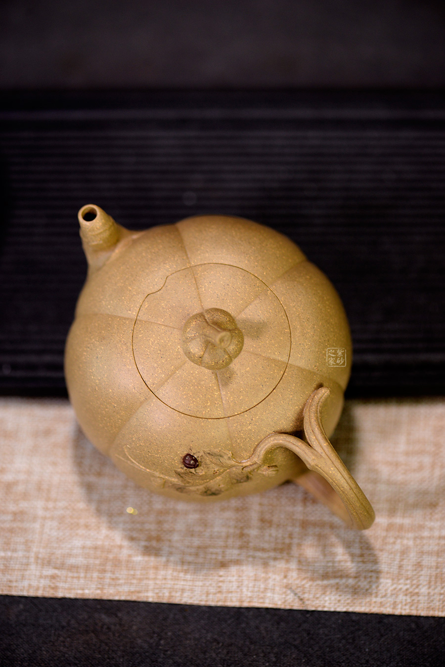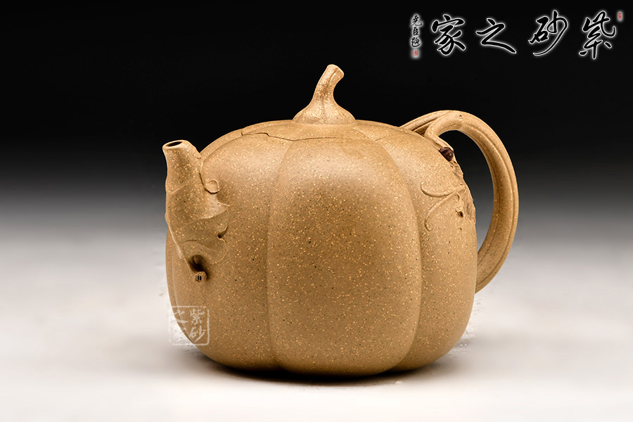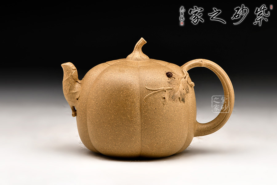 南瓜壺是紫砂壺中很常見的一種款型。此南瓜不僅外形酷似南瓜,更是集聚了南瓜的神韻,猶若瓜熟即將待落。壺鈕、壺把嫉皆以南瓜藤為原型,形象逼真。壺嘴則若南瓜葉包裹而成,精巧別致,創(chuàng)意極新。壺把處一南瓜藤胥出,藤上瓜葉、瓜仔靈氣十足。更妙在于一只瓢蟲正趴在瓜葉上,增添無限情趣,大自然氣息濃郁。