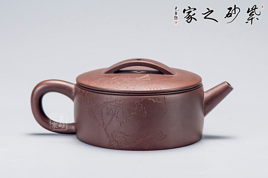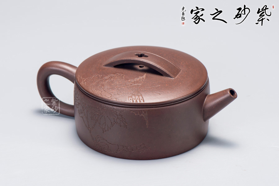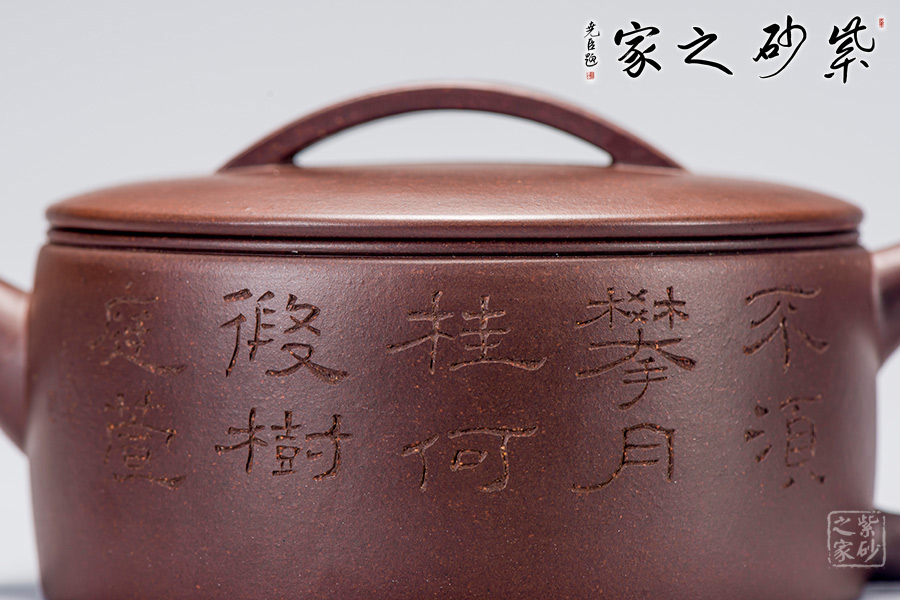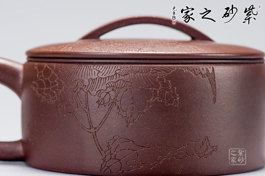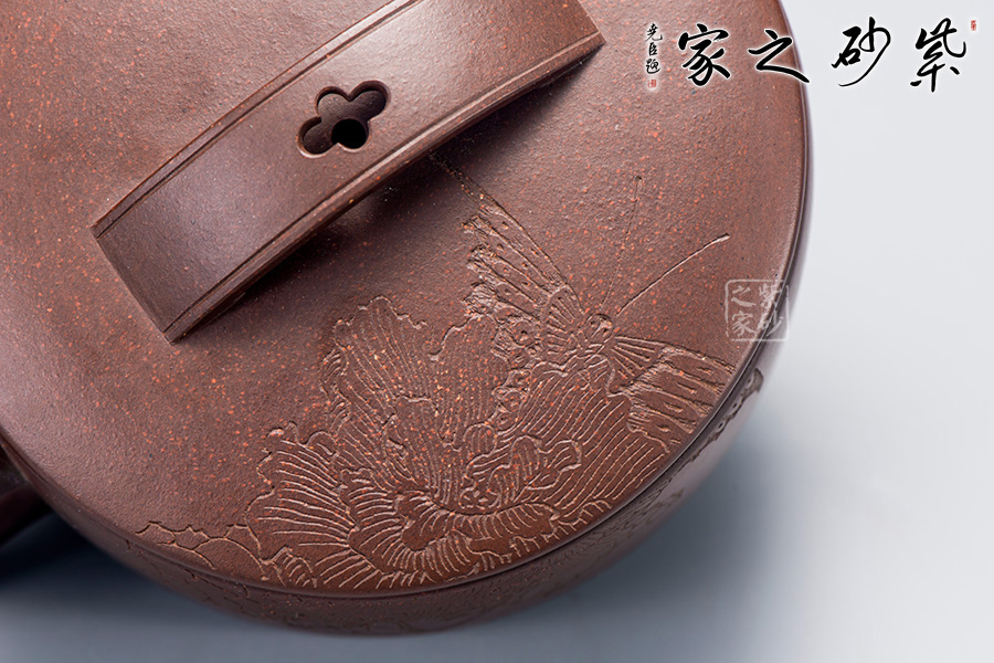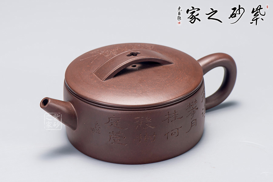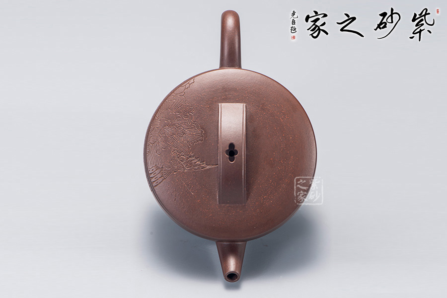 身直而口大,平蓋板子母線吻合,很是闊朗大氣。橋鈕上鏤雕裝飾,更添古韻。直嘴圓口,出水流暢,耳型端把,彎曲有度。