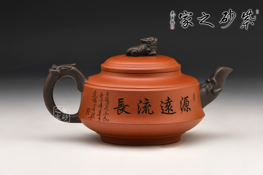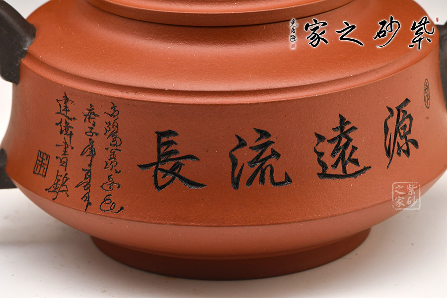 源遠流長壺型制高貴典雅,氣勢不凡。運用雙色泥技法,將壺身與流、把、鈕顏色上區(qū)分,整體卻和諧統(tǒng)一,渾然一體。