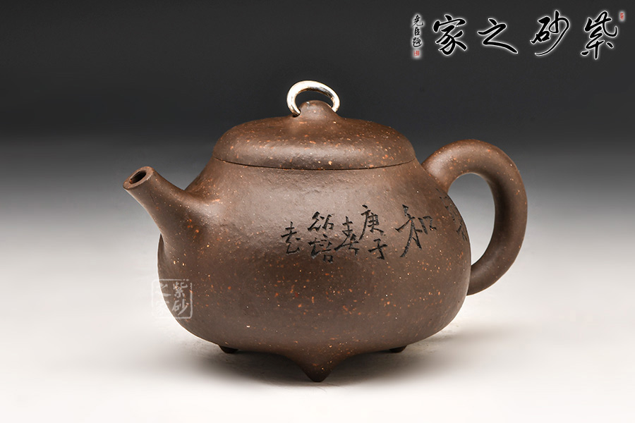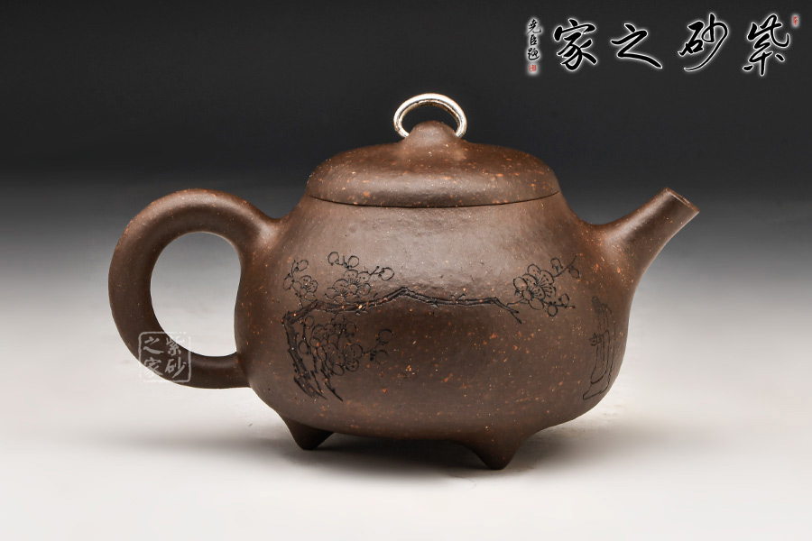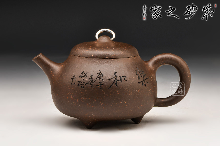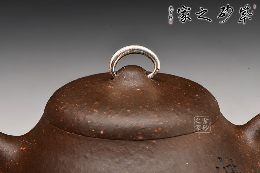 乳瓜壺:壺呈圓腹、下寬上收;直炮流、環(huán)狀柄;乳鼎鈕、三乳足。壺鈕造型極其別致,用銀制環(huán)穿過,提捏方便,色差上也讓人眼前一亮。