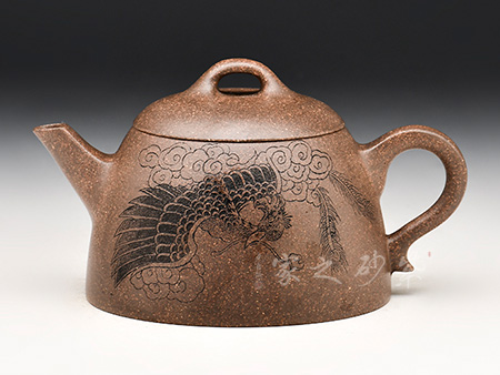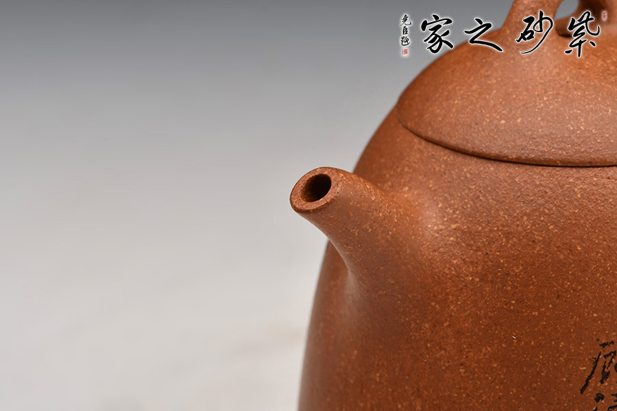 特點:原礦因含緞泥、紅泥、紫泥等諸多共生礦,陶之后,于深沉之“橙紅色”底上,滿佈五彩斑斕的粗細(xì)、深淺之紅、黃星斑點。