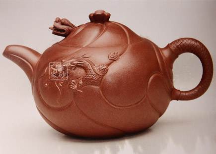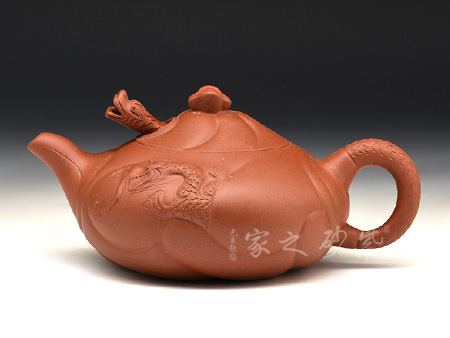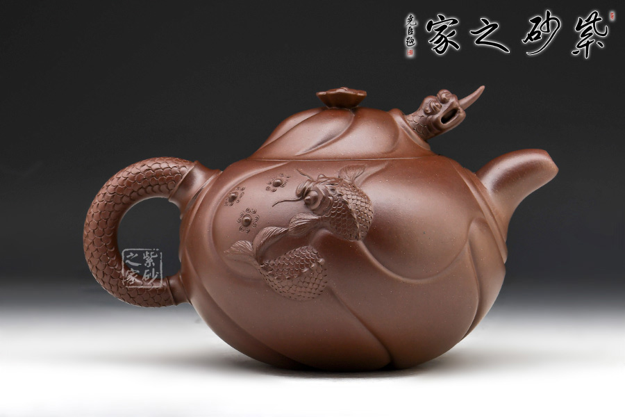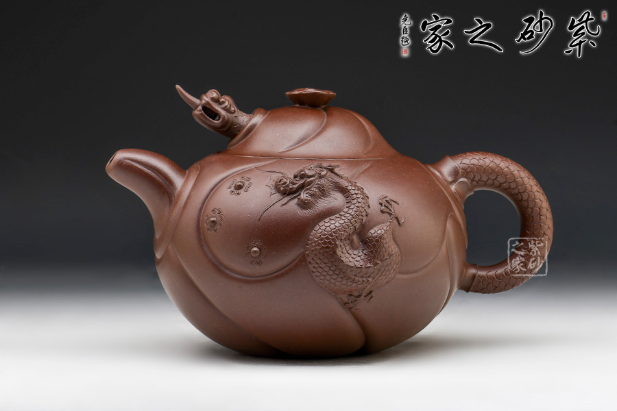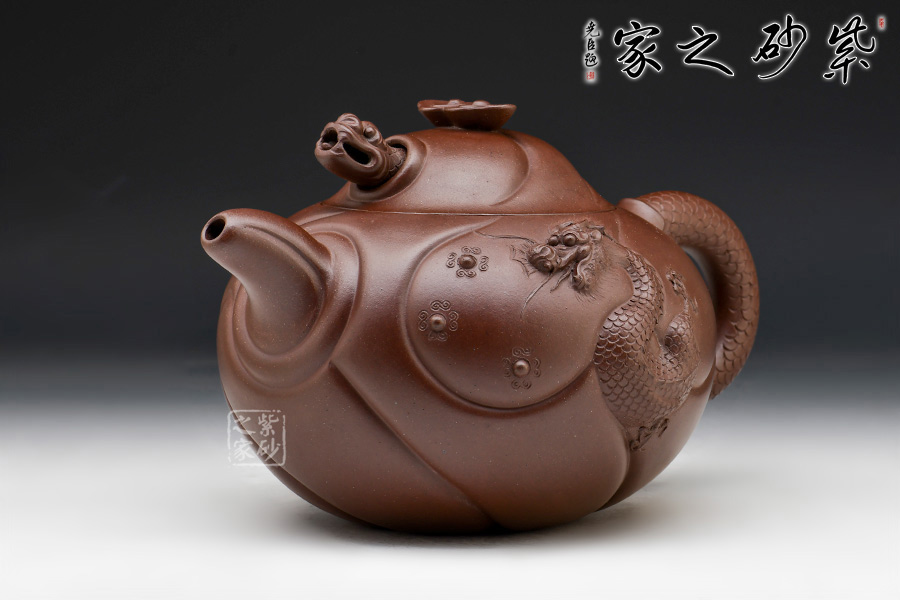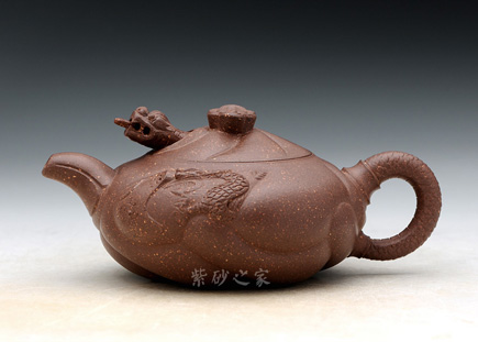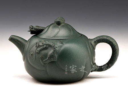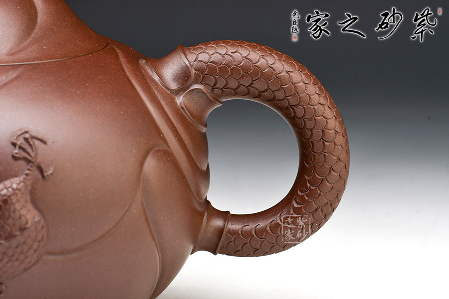 選用原礦底槽青手工制作。壺嘴彎流,壺把滿飾魚鱗紋;壺身為圓形,由幾塊規(guī)則的波浪組成,正面有巨龍在波浪中翻滾,背面有金魚在波浪中游玩;壺蓋呈波濤涌起狀,有龍頭至正面探出,龍頭可伸縮,頂上如意型鈕。