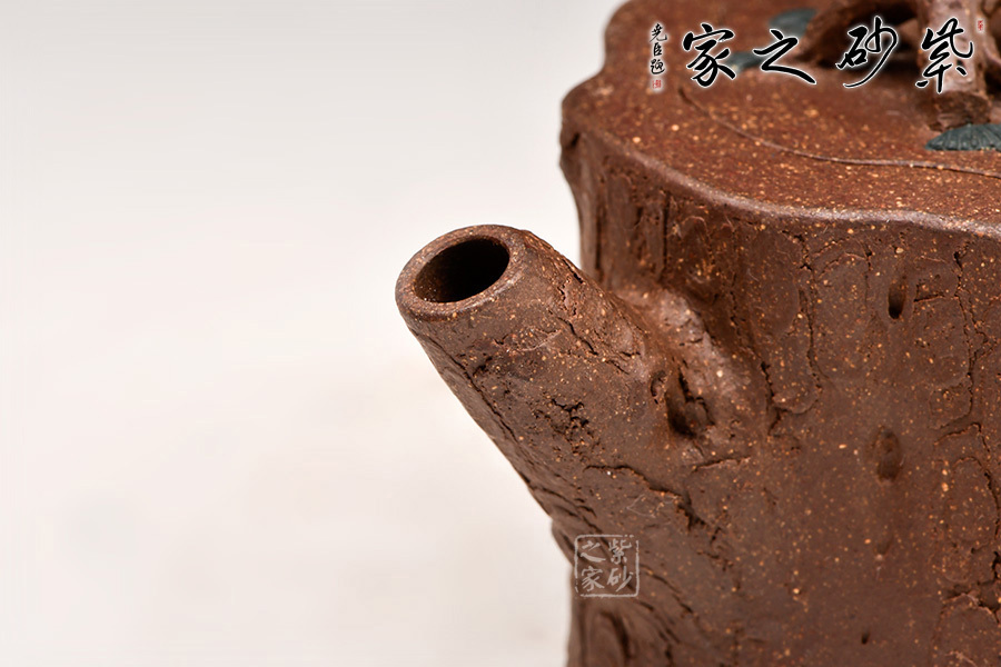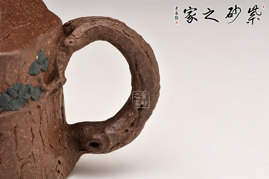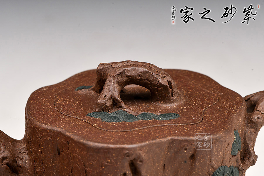 壺為古松松樁造型,壺體為一不規(guī)則若圓筒形的松樹樁,結(jié)疤錯落有致,或凸起或斑斑駁駁,壺身及蓋面新生松針叢叢,自然生機。