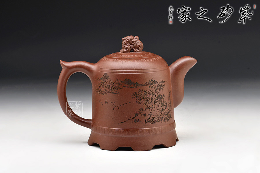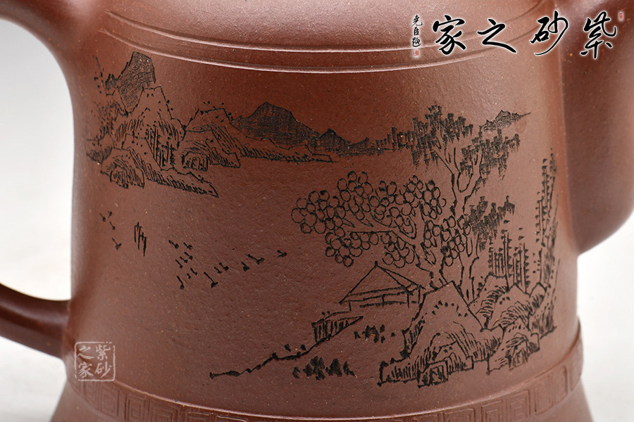 壺身正面篆刻山水美圖,群山連綿、水平如鏡、枝勁葉茂;壺身反面篆刻的是“題品云山歸畫卷”二字,儒雅端和。