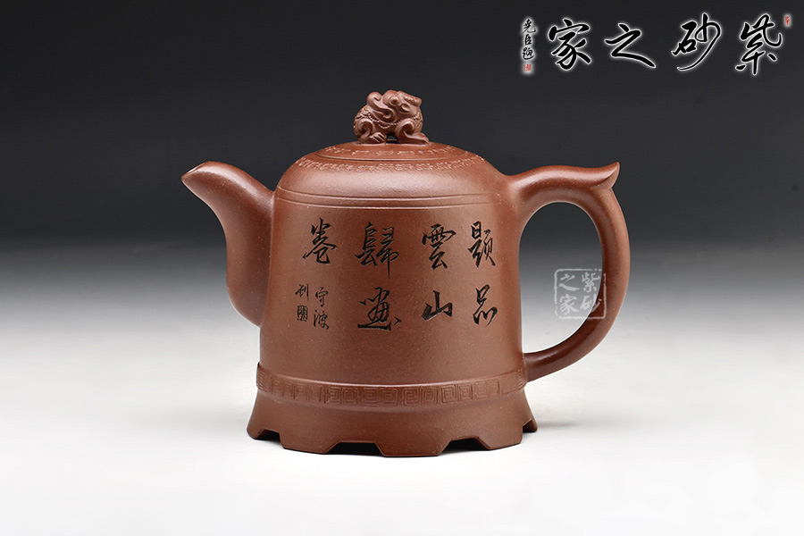吳六君老師這款金鐘壺十分大氣磅礴,古雅卓絕;采用的是老紫泥制作而成,古樸端莊,溫和典雅。