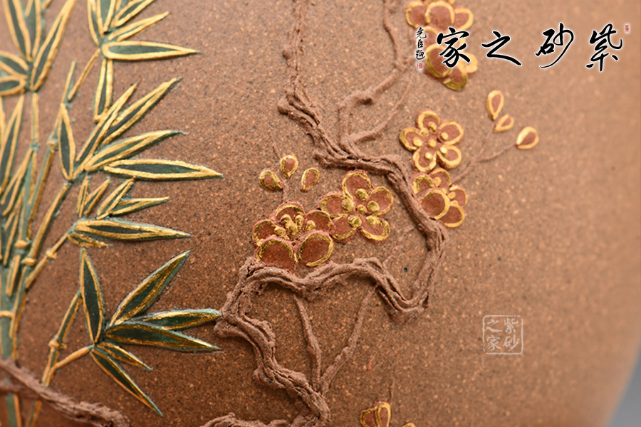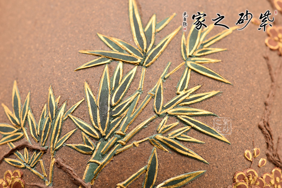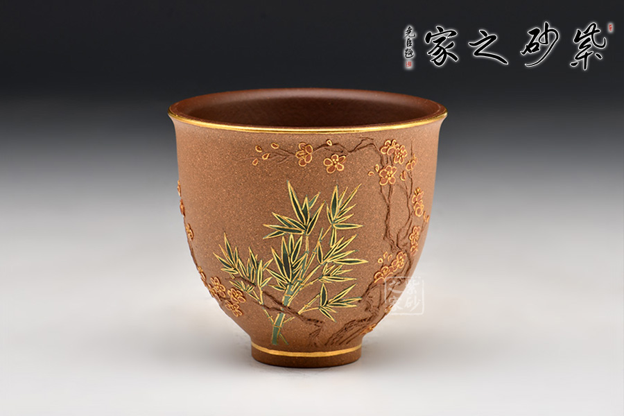 梅竹雙清杯,紫砂泥料制作。杯身修長亭立,杯口大開,杯沿一圈金色。杯身以泥繪工藝用梅花和竹為裝飾,顏色清新自然,造型栩栩如生,讓人愛不釋手。