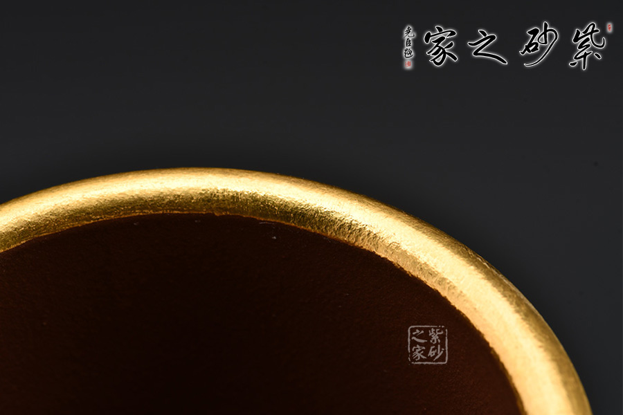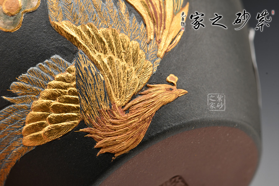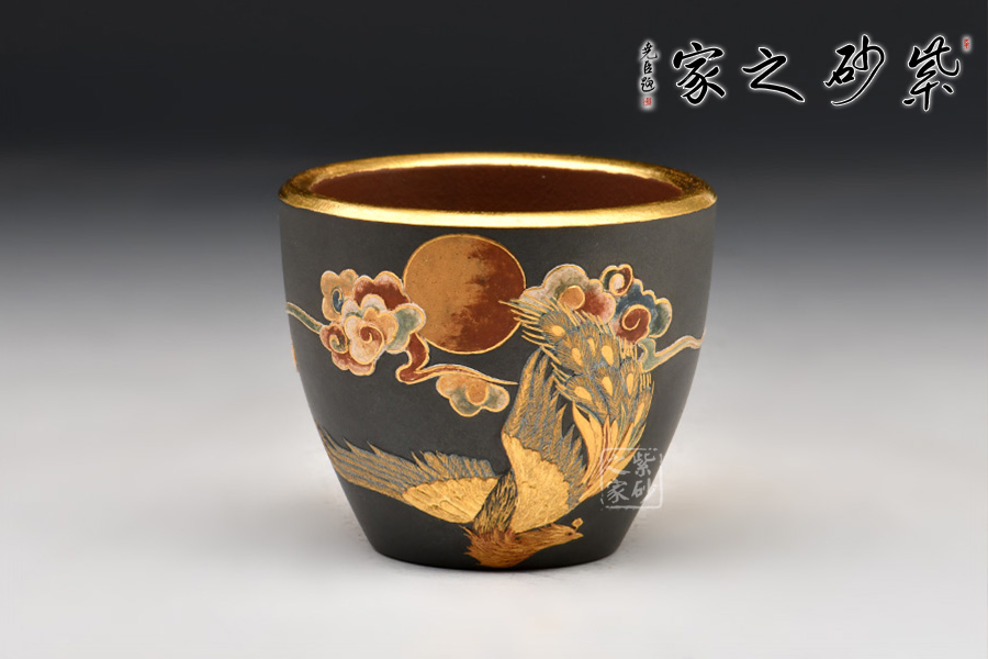 金鳳祥瑞杯,紫砂泥料制作。杯口大開,杯沿一圈金色醒目。杯身以泥繪工藝描繪一只美麗的鳳凰翱翔九天,金光閃閃,瑞氣逼人。