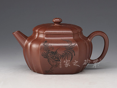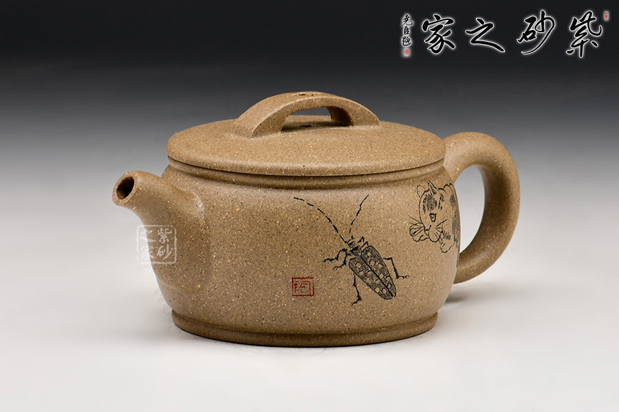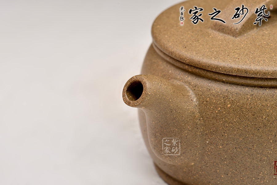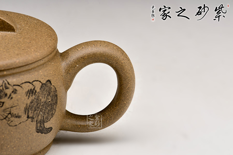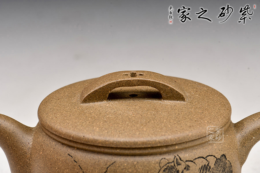 身直而口大,壓蓋板子母線吻合,很是闊朗大氣。橋鈕上鏤雕裝飾,更添古韻。彎嘴圓口,出水流暢,耳型端把,拿捏舒適。