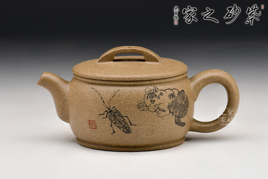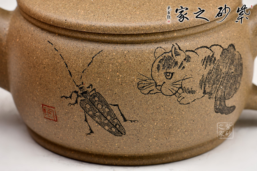 壺身繪刻一貓一天牛,生動(dòng)傳神,極富生活情趣。
