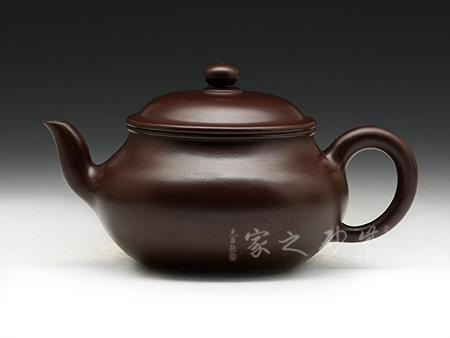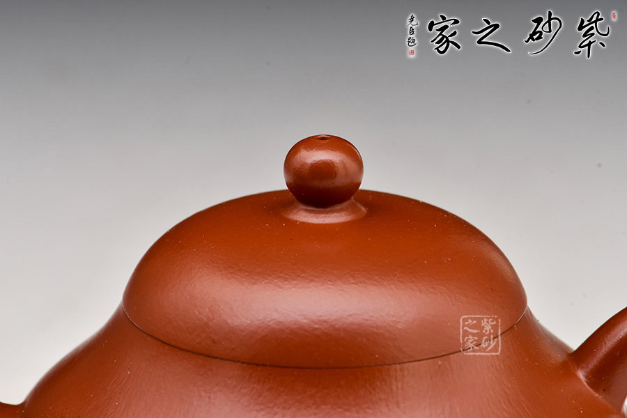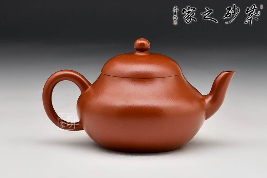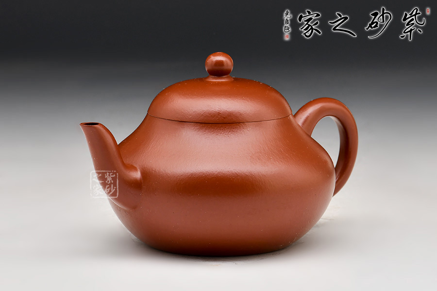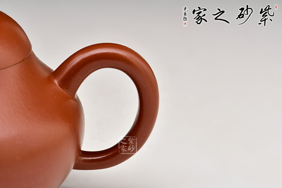 其造型為傘形蓋,蓋頂有寶珠紐,短頸,其下漸豐成下垂的圓腹,彎流、曲柄。壺口和壺柄與壺身相得益彰,以小而精襯托出壺身的圓與潤,將壺韻淋漓盡致地展現(xiàn)了出來。