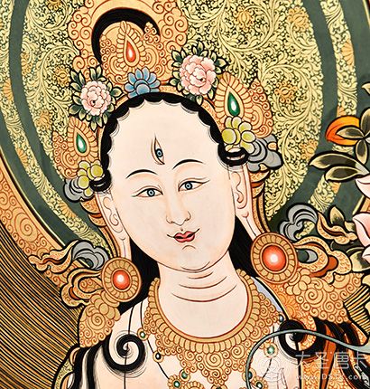 | 唐卡“師傅”開臉,筆路穩重流暢。體現完美天人相,可見佛菩薩慈眉善目,賦予唐卡畫像生的靈氣。 | 細節決定品質,點睛之筆不到位影響整體美觀,五官比例不協調,面目呆板,缺乏靈氣。 |