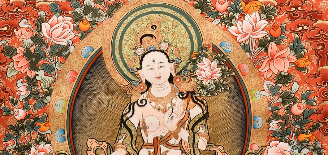 白度母是觀世音菩薩左眼眼淚所化,與長壽佛、尊勝佛母合稱為長壽三尊,能夠賜予女性長壽。她的雙手和雙足各生一眼,臉上有三眼,象征她能讀懂并開解女性的煩惱與憂愁,又稱為七眼佛母。