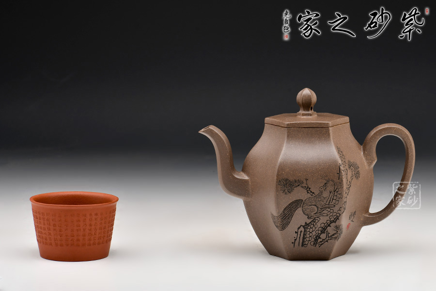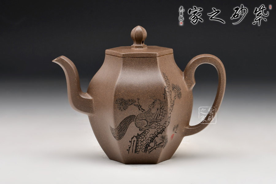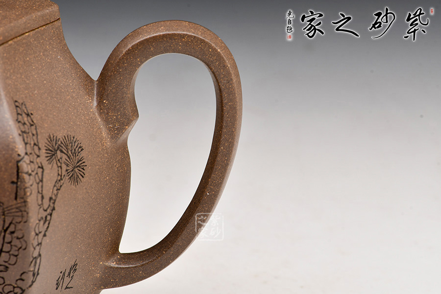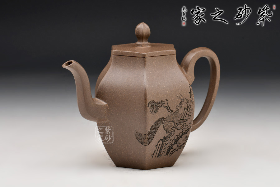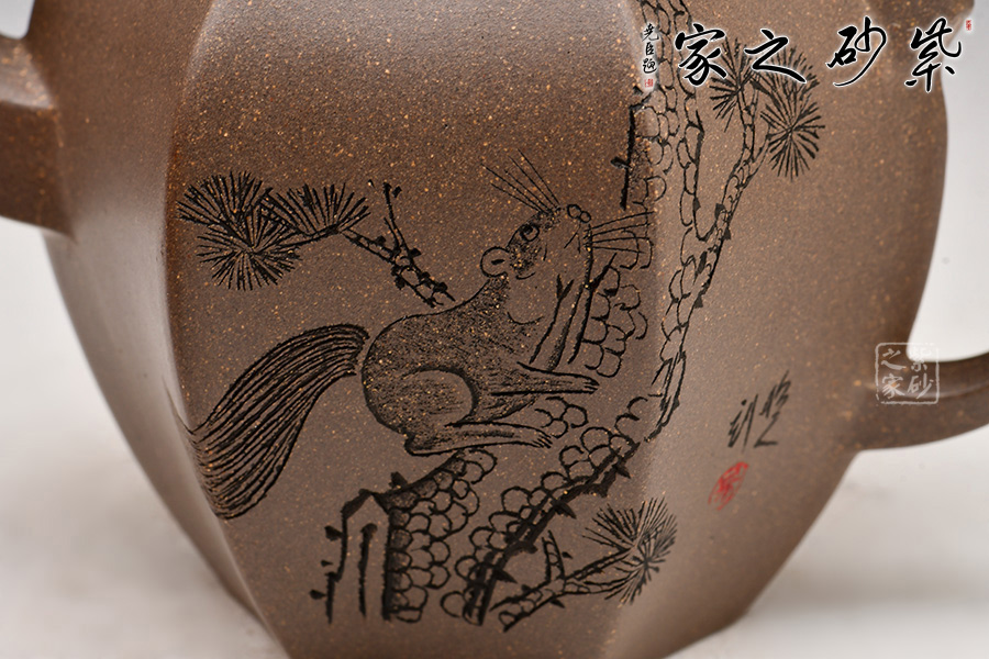 壺身正面繪刻“松鼠攀爬松樹”圖,松鼠栩栩如生,充滿逸趣;背面銘文“心清可品茶”,輕松閑時(shí)之情油然而生。