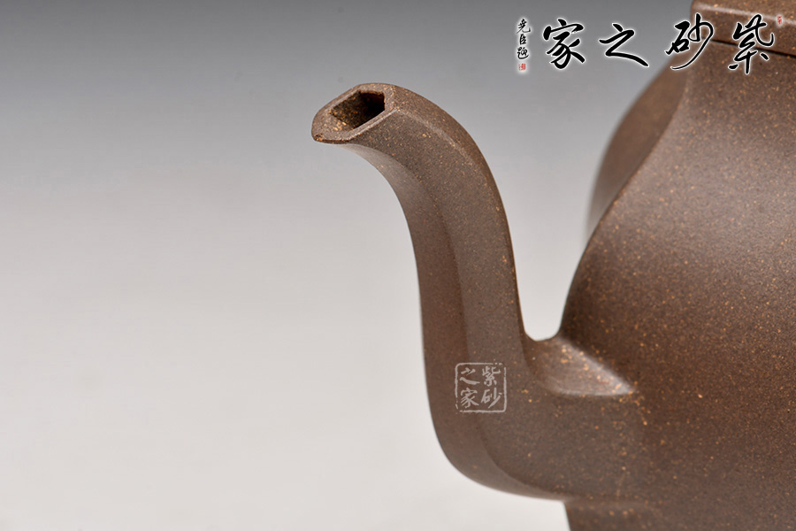 此壺采用青玉砂制作,身筒與壺蓋、壺鈕皆為混六方造型,身筒高矮適中,亭亭玉立,壺身線條流暢且剛直,彎曲有度。壺蓋無(wú)論往哪個(gè)方向轉(zhuǎn)度皆可與壺身相對(duì)應(yīng)。壺鈕似六方壺身縮小版,倒立壺蓋上,小巧別致。四方壺嘴和壺把與壺身搭配自然,暗接相連。三彎流順暢利落,耳形端把提捏稱手。整個(gè)作品無(wú)處不透漏著方器的效果。