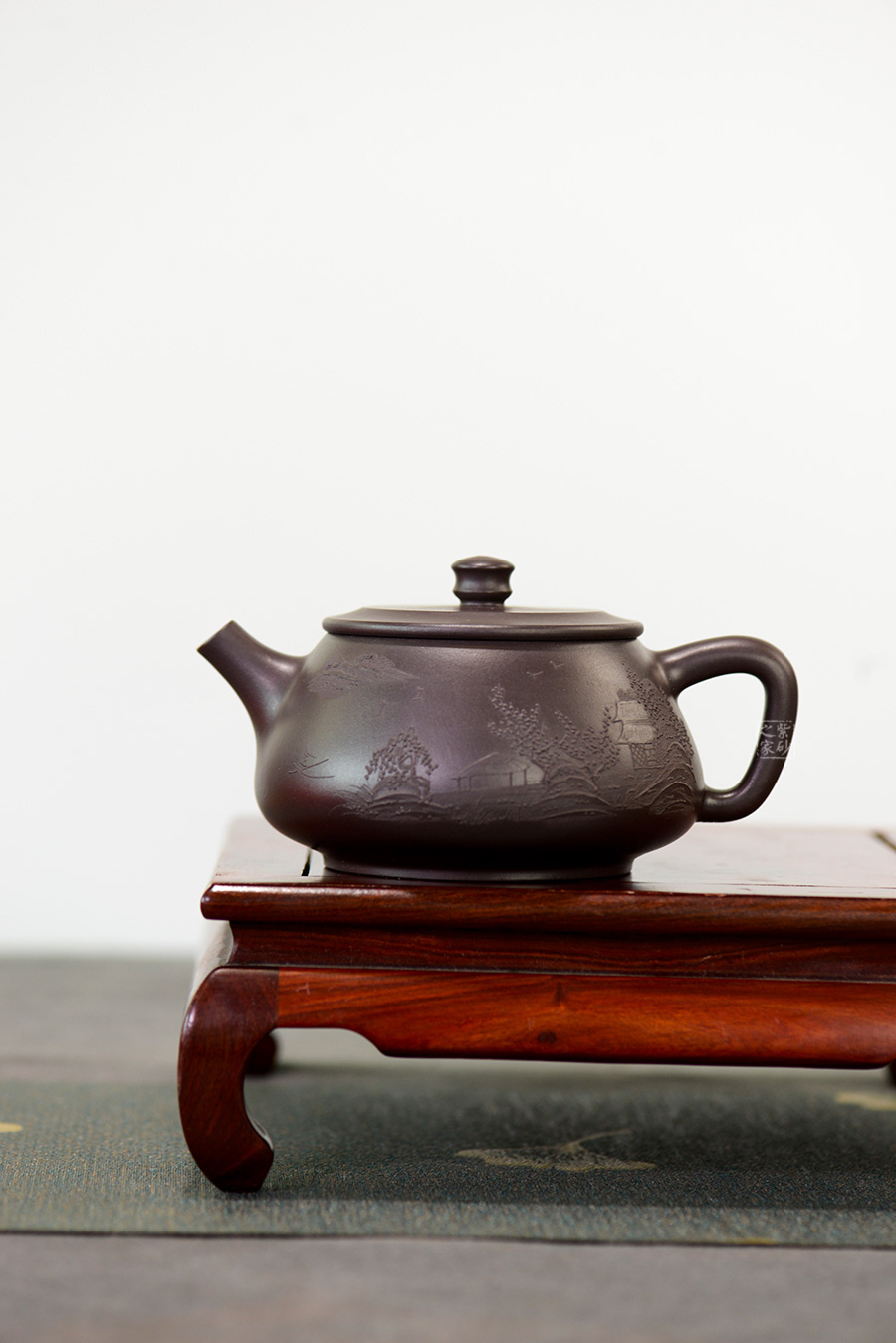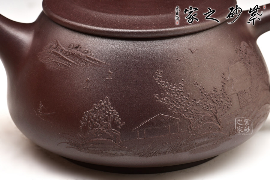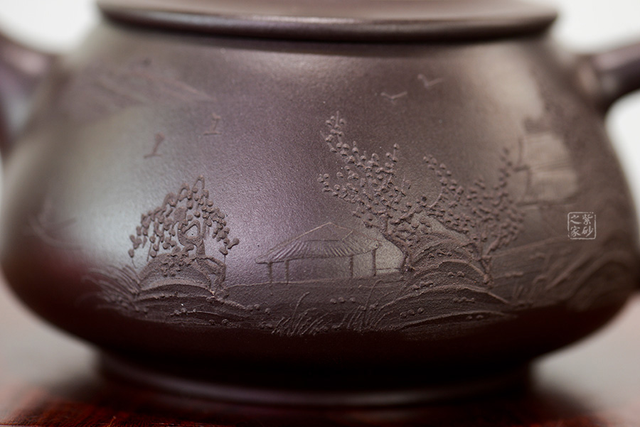壺身前面泥繪精致山水人家圖案,大方耐看,惹人心喜。