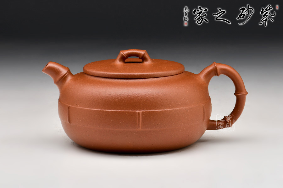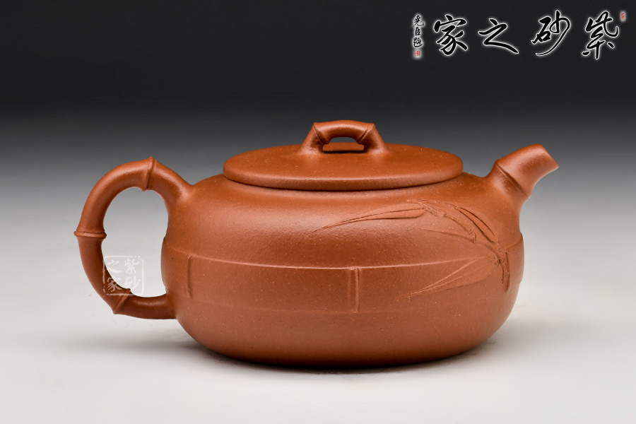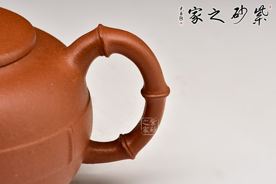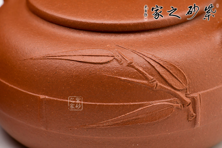 清竹雅韻紫砂壺:原礦紅泥制作,光潔明亮。壺身扁圓豐盈,壺腹以一圈竹片裝飾,似纏著腰帶。壓蓋,嘴、把、鈕取竹節(jié)為形制,蒼勁有力,逼真自如,既展現(xiàn)竹子頑強的生命力,又展現(xiàn)其不屈風骨。一側(cè)壺面有小竹節(jié)胥出,竹葉清晰可見,風雅無窮。