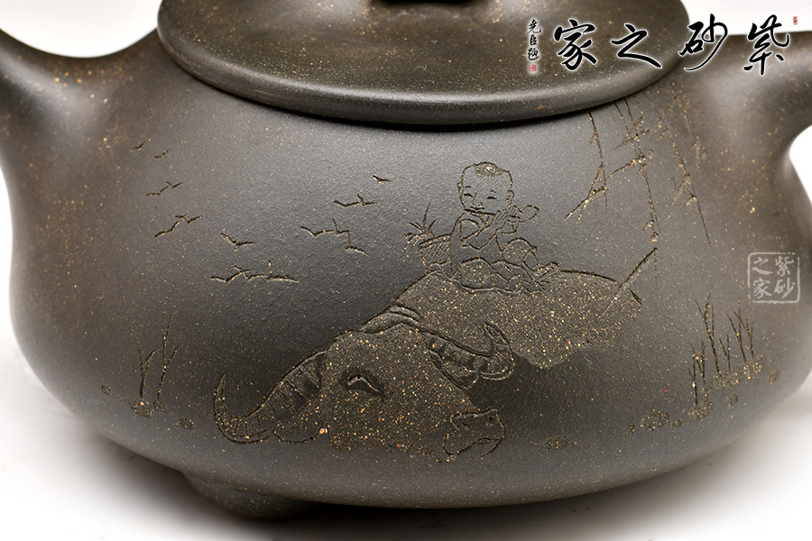A面: 裝飾: 牧童騎黃牛 裝飾者:木石 裝飾內(nèi)容: 竹林間,牧童騎在黃牛上,笛聲驚起飛鳥一片。