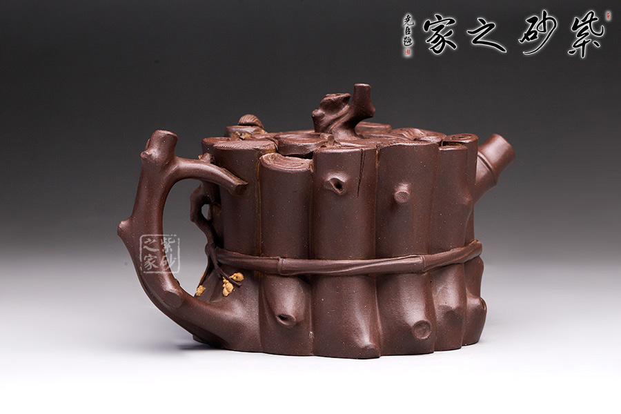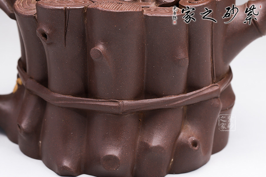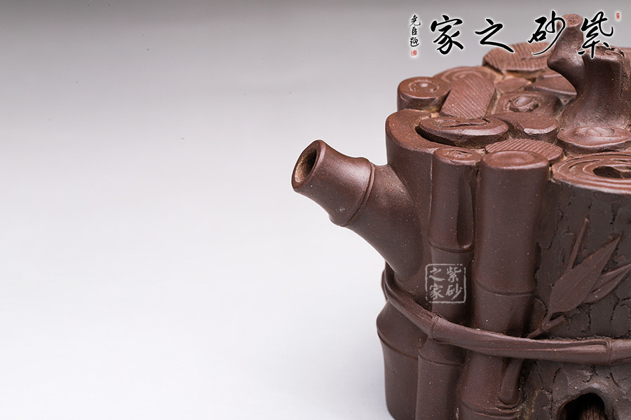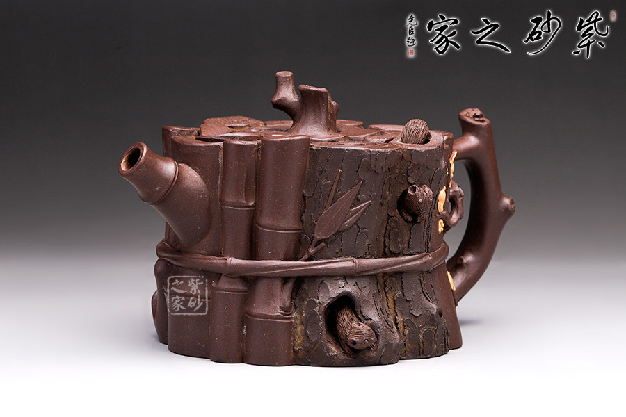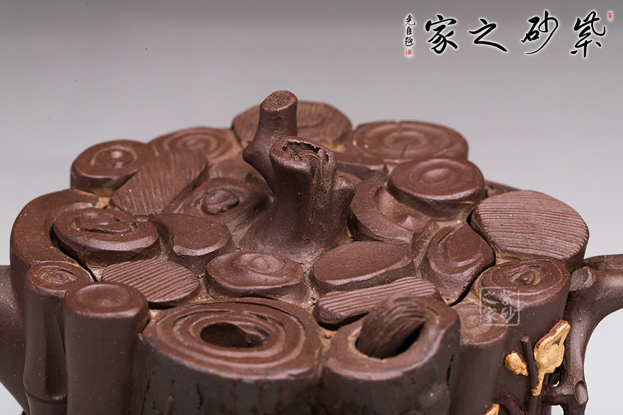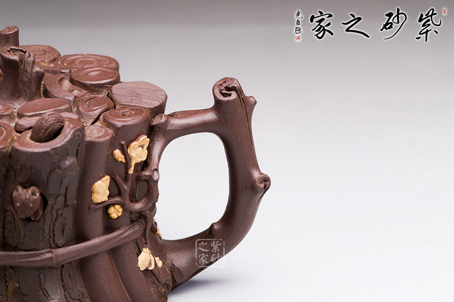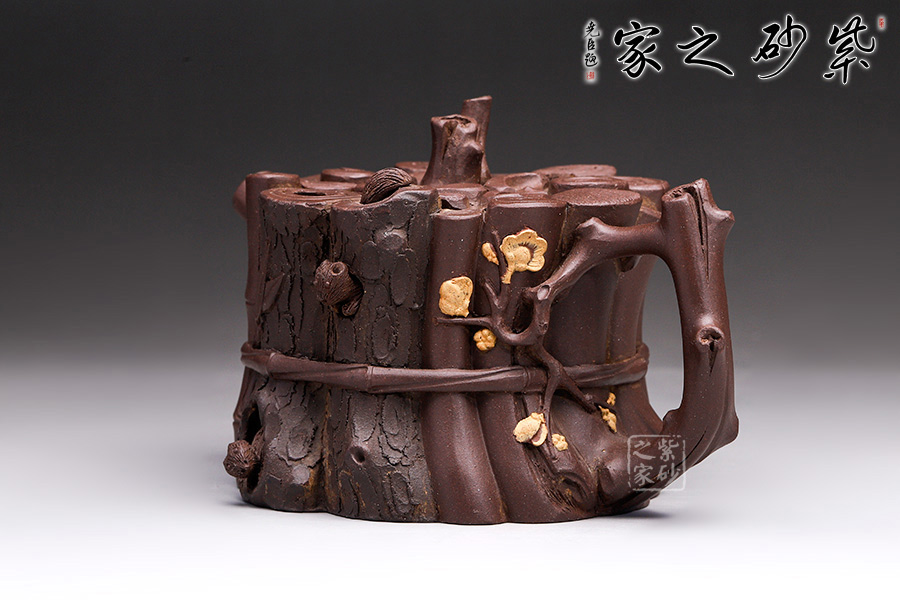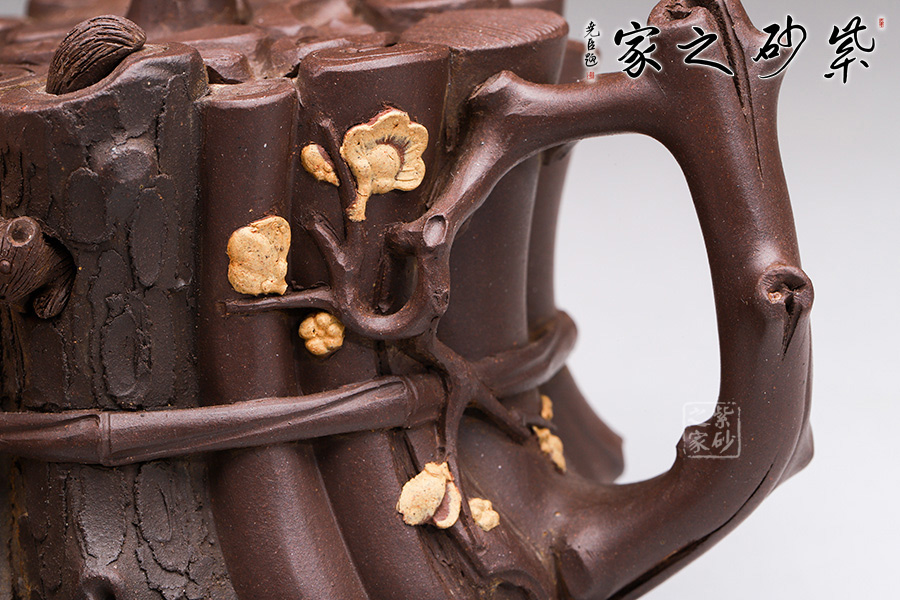 這款“束柴三友壺”運用花器制壺的理念,惟妙惟肖、師法自然,技術(shù)上采用紫砂塑形獨有的捏、貼、塑、鏤、堆等多種技法,對松、竹、梅這三種物象進(jìn)行重新加工提煉。