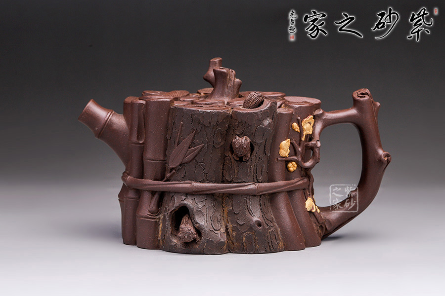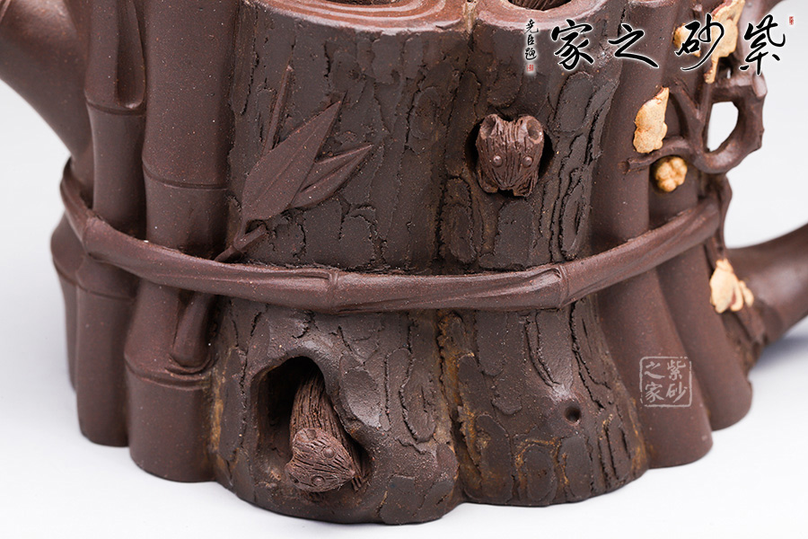壺身取老樹樁柴火堆,里面包涵了嶙峋松段,附著在虬曲枝干上的俏麗梅花,再加上竹枝竹葉,彼此呼應(yīng)又共為一體,最后,僅用一根鏤空竹條將三君子捆綁在一起,呈現(xiàn)一種輪廓明晰之感。此壺突出一點是虬枝樹洞里面的“小松鼠”,可愛的松鼠形象的出現(xiàn)一下子打破了整體的沉寂,增添一絲自然生動之趣。