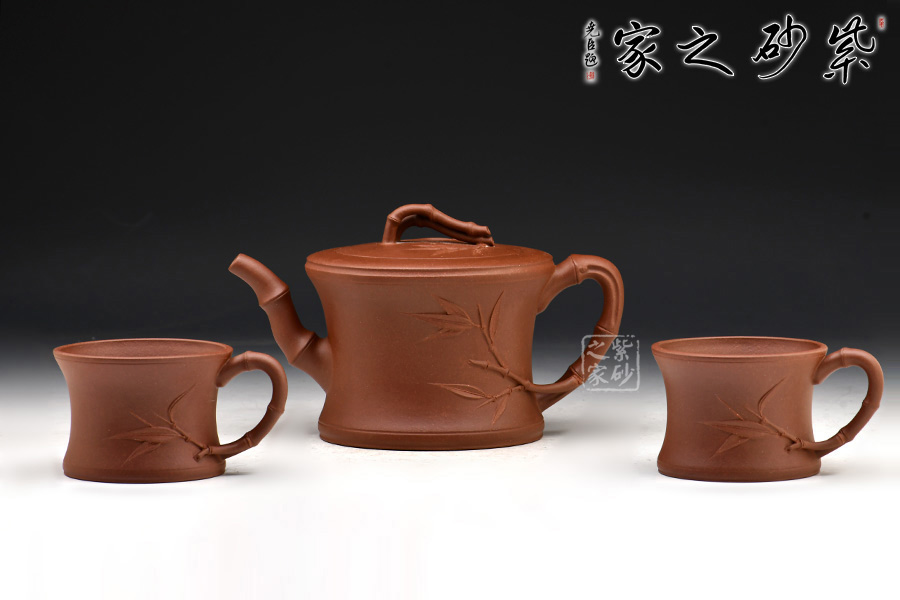 一品竹套組,一砂壺兩砂杯,壺身似竹節(jié),嘴、把、鈕皆宜竹枝為形制,生動(dòng)形象,逼真自如。有竹葉自把、鈕胥出,筋節(jié)分明,紋理清晰,更顯生機(jī)無(wú)限。