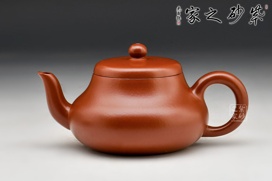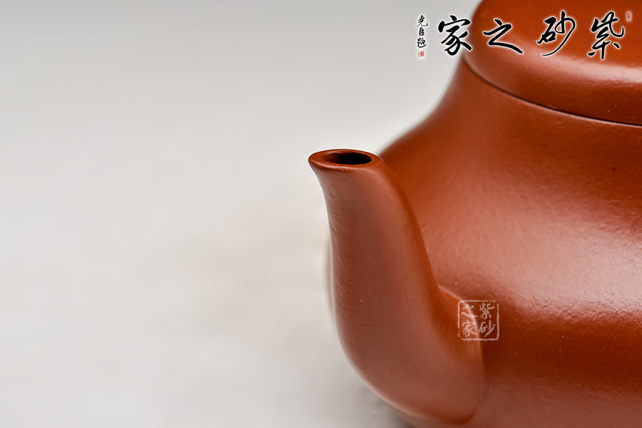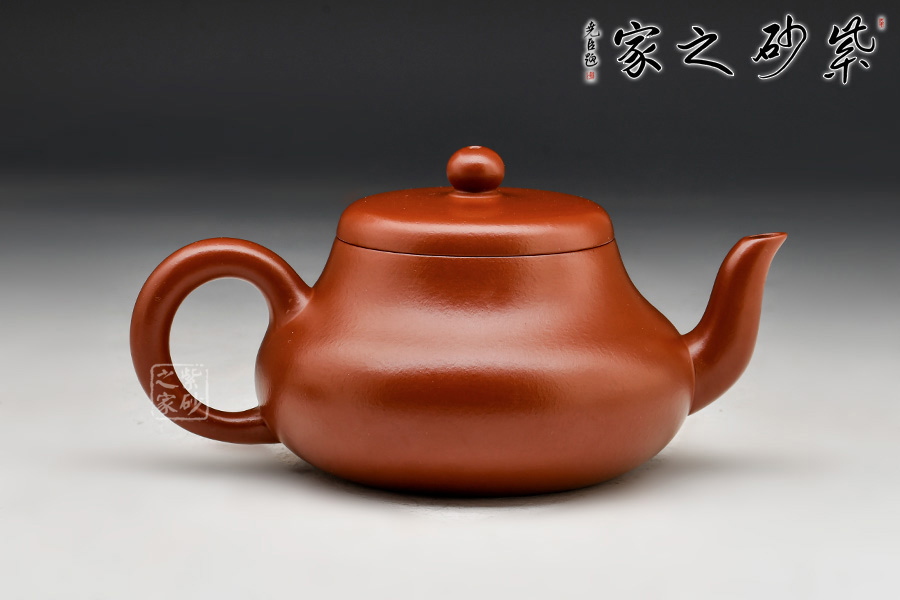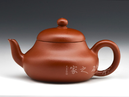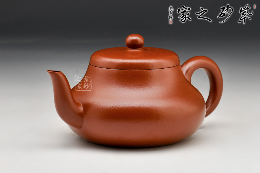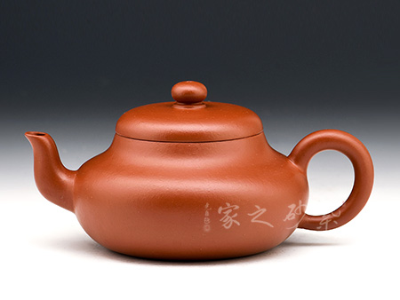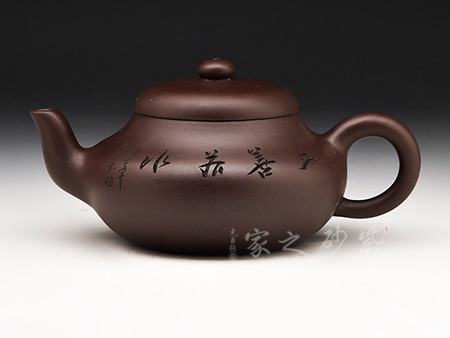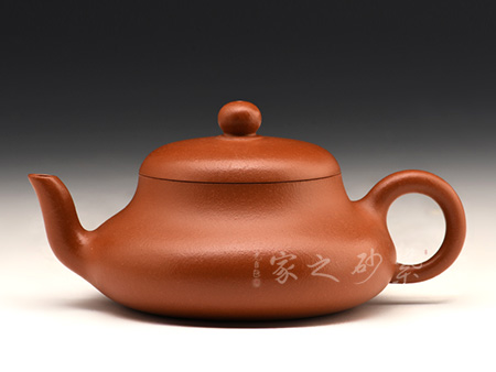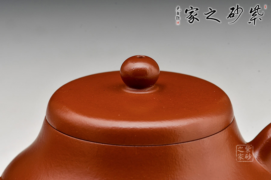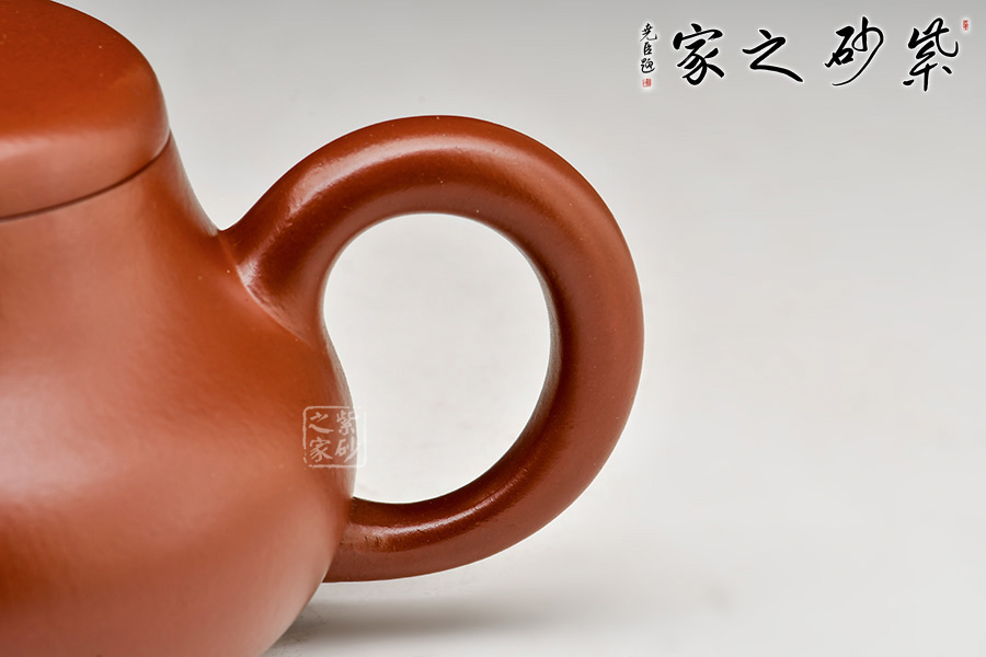 呈鼓腹矮梨形,三彎流朝天,圓環(huán)把,平蓋圓珠鈕。整器簡樸大度,個性鮮明,在角線、面的處理上達(dá)到了“均、挺、圓、正”。