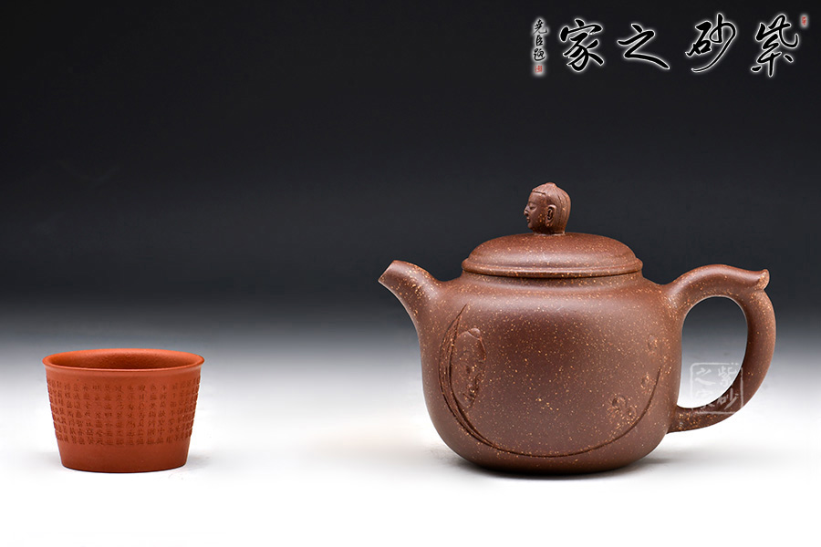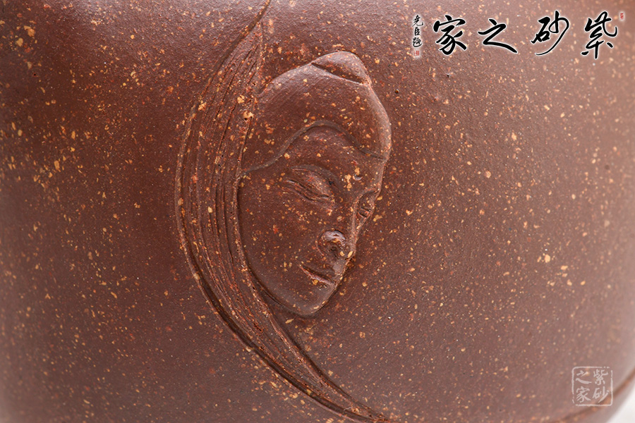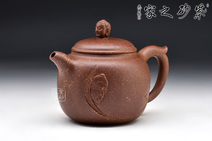 該作品嘴、把圓潤流暢,一氣呵成。壺身之上捏塑以佛像,意為無量壽佛。