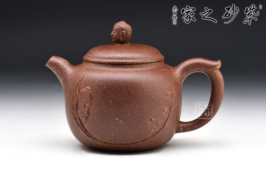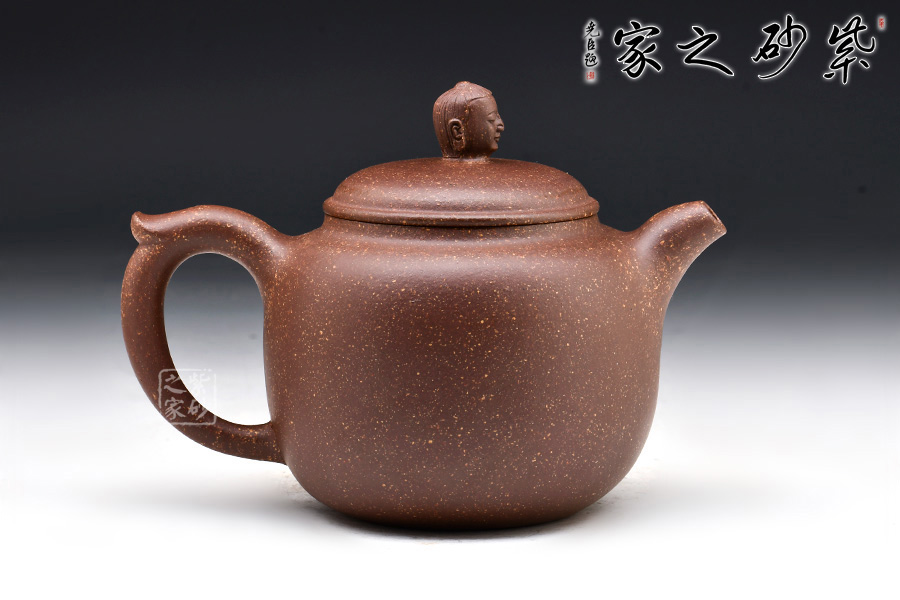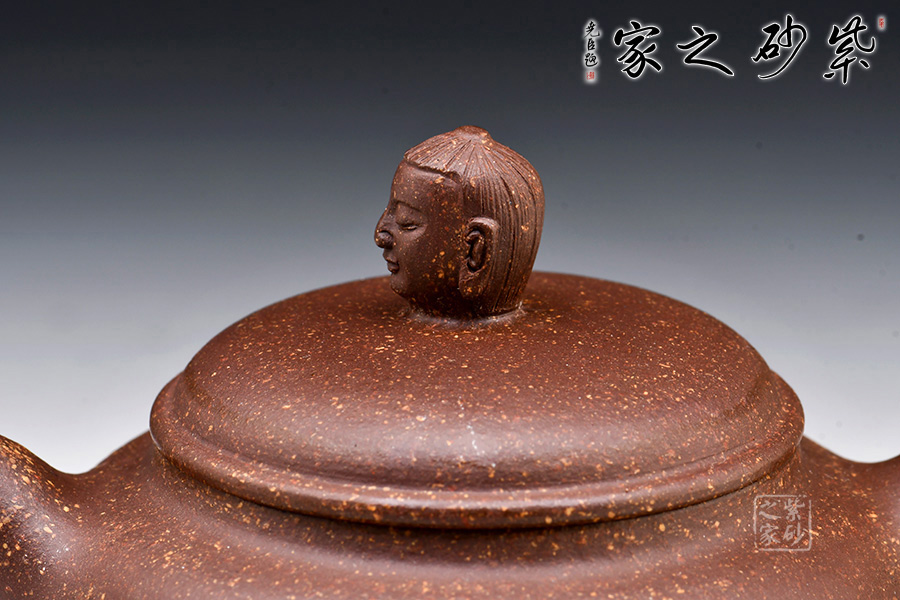無量壺式經(jīng)匏尊壺改良而來,采用粗砂紫泥制作。造型飽滿,壺蓋微鼓,口沿起厚雙線,上以一只佛頭為鈕,精細(xì)小巧,甚是逼真;短彎流上挺,耳把略上揚(yáng)帶飛端。