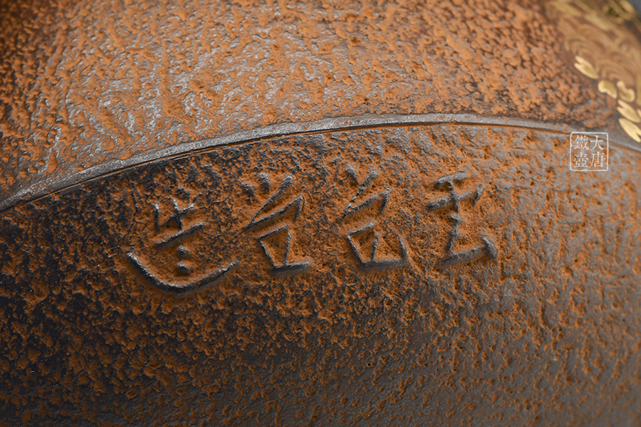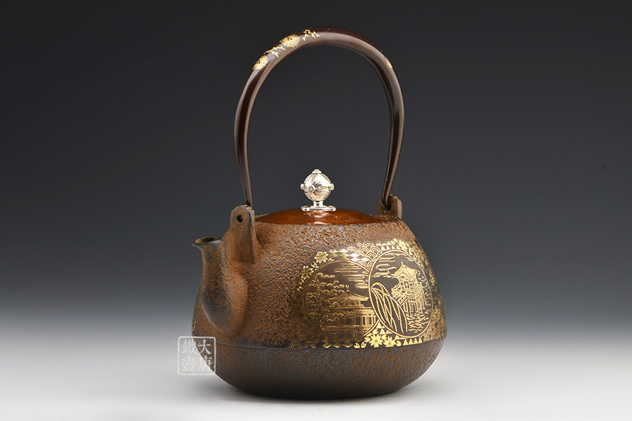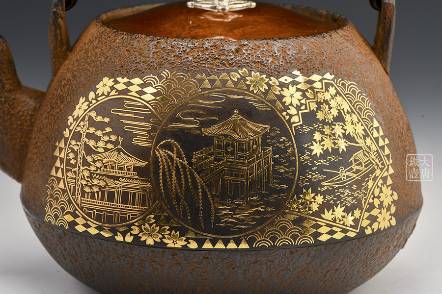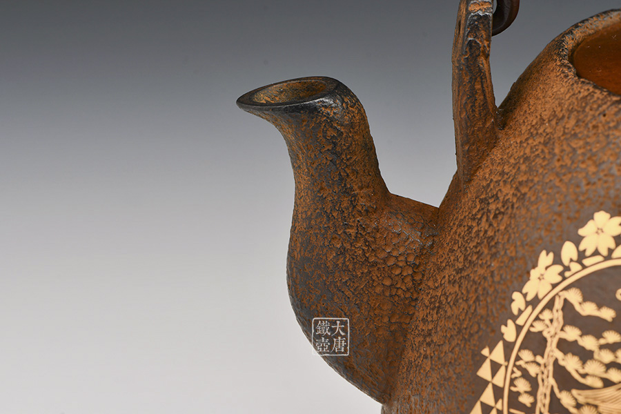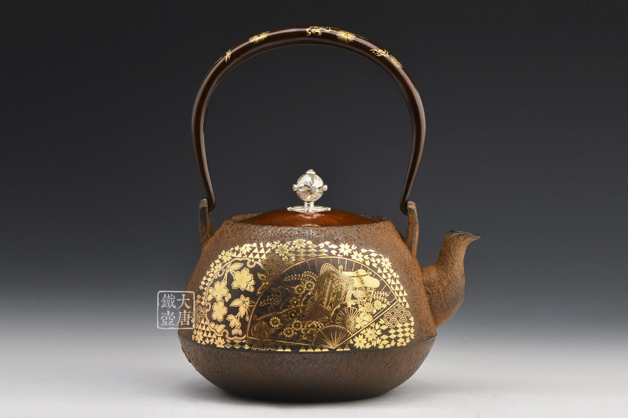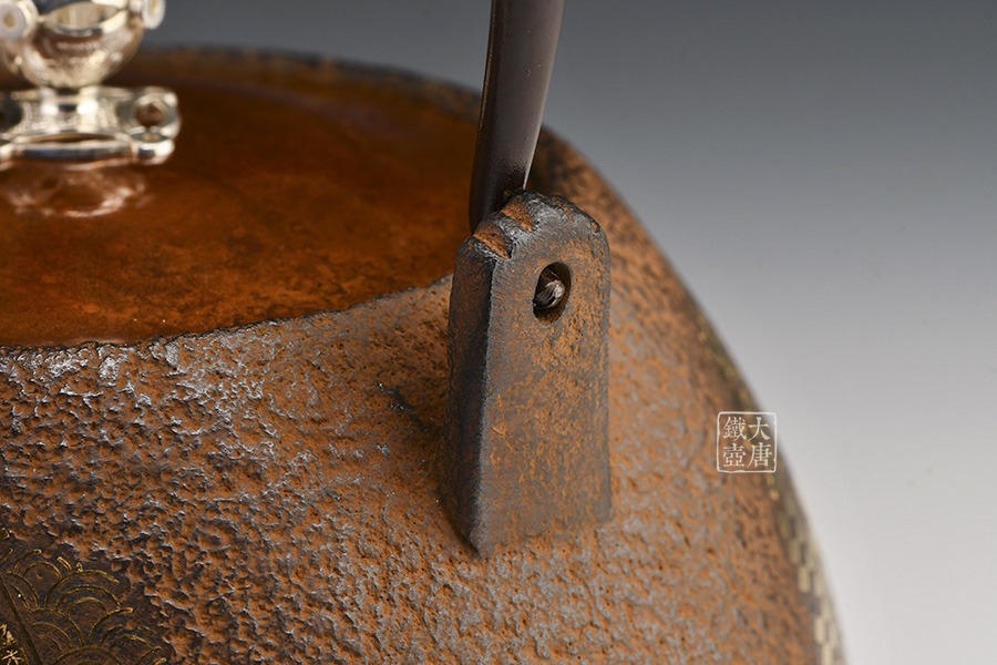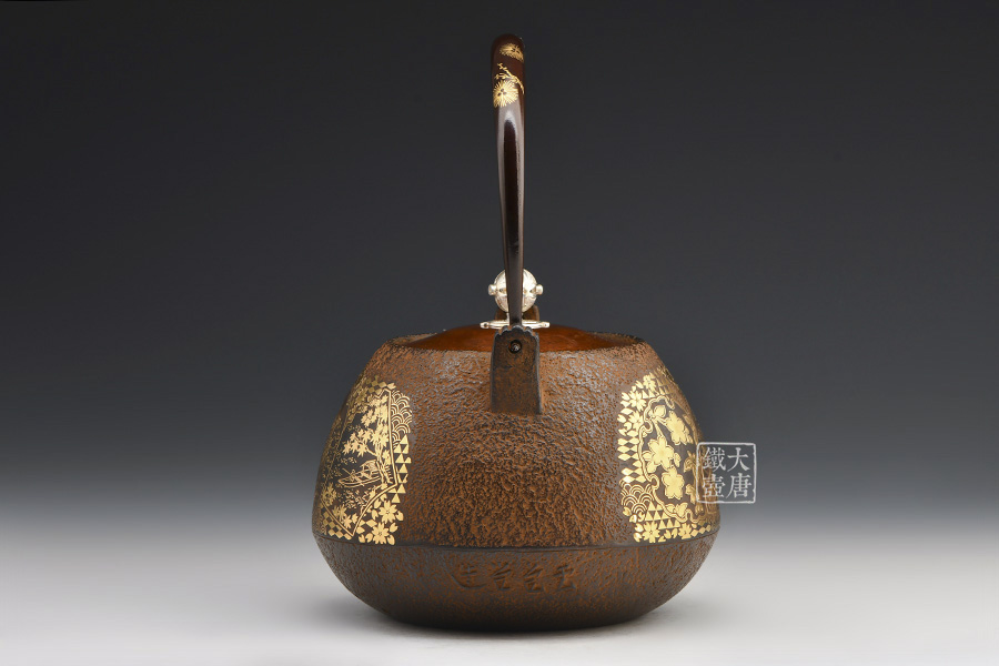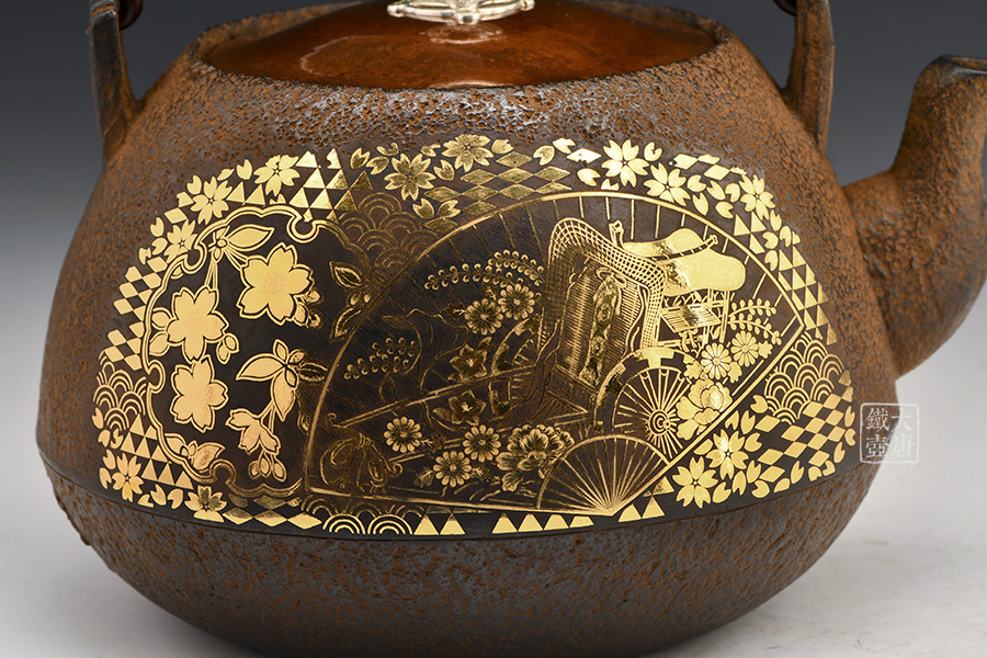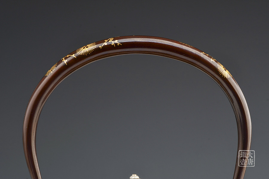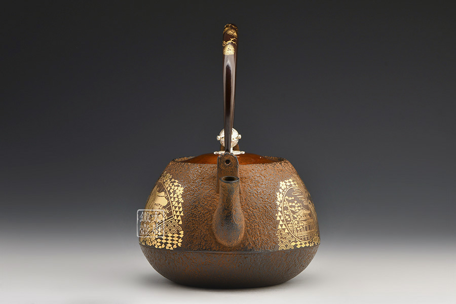 云色堂的鐵壺以豐美的裝飾技巧最為人稱道,描金及鑲金技術(shù)十分成熟。紋飾圖案的線條借鑒了日本古典瓷器的樣式。同時(shí)在一些細(xì)節(jié)的構(gòu)建上,云色堂也不惜使用珍貴的材料來彰顯他華貴的氣質(zhì)。在眾多堂口的鐵瓶中,這種特色使得其作品有很強(qiáng)的辨識性。