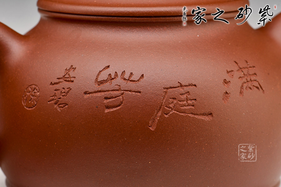 作品由徐安碧老師自銘,壺身正面陶刻“一壺春秋月,雅趣茶中來(lái)”;壺身反面陶刻“滿庭春”。