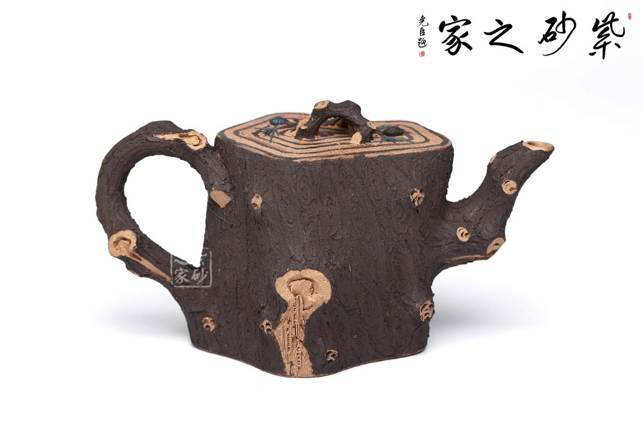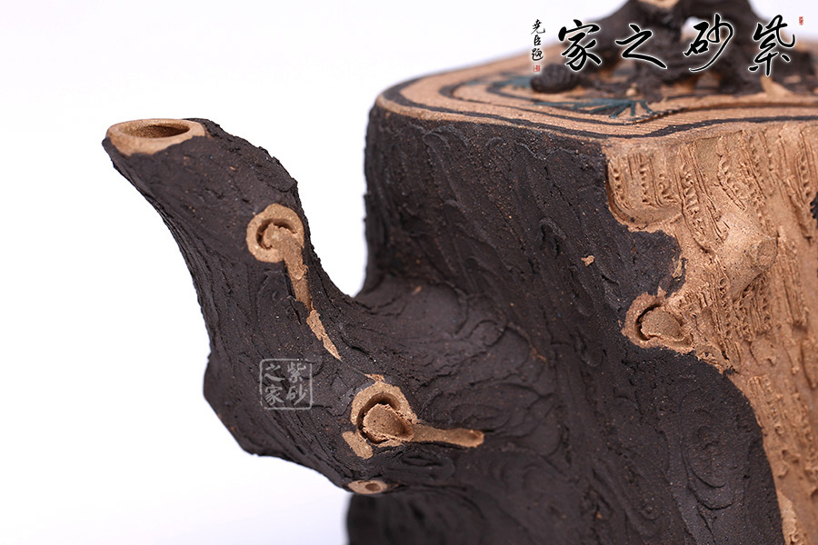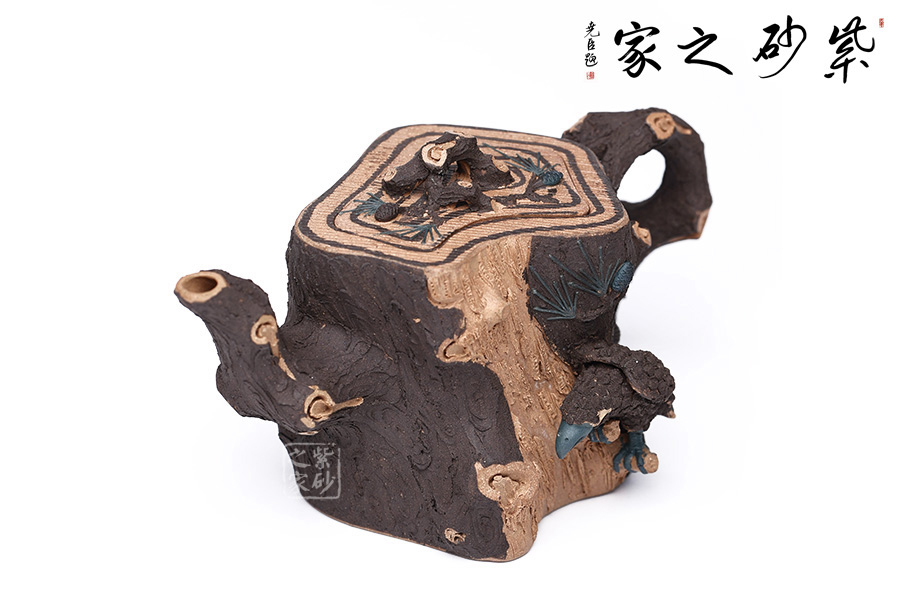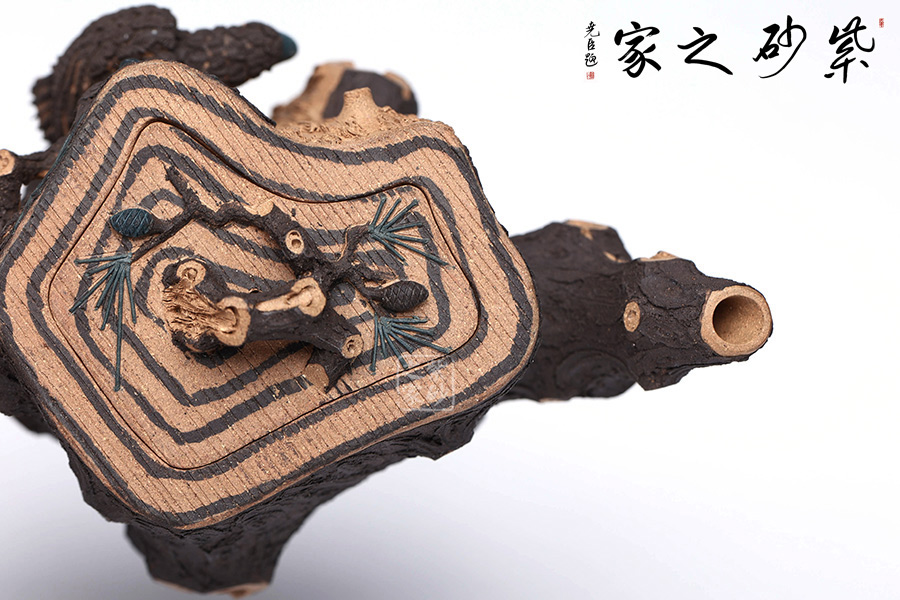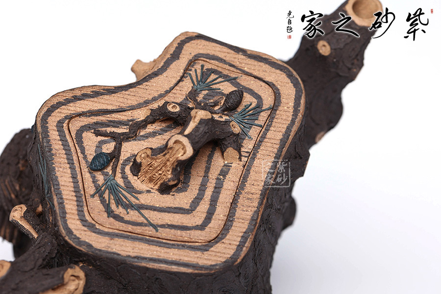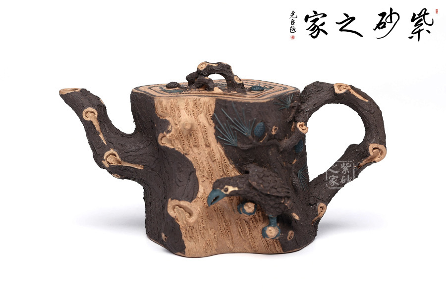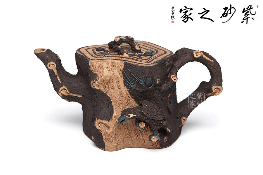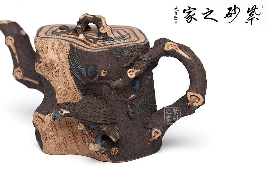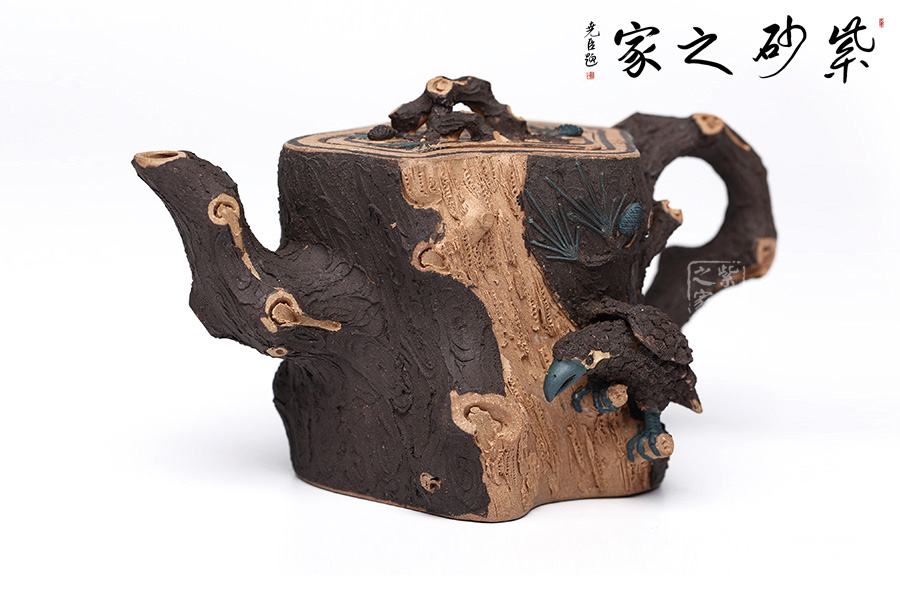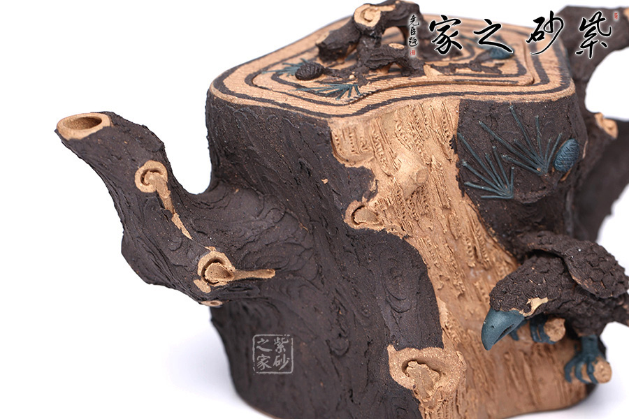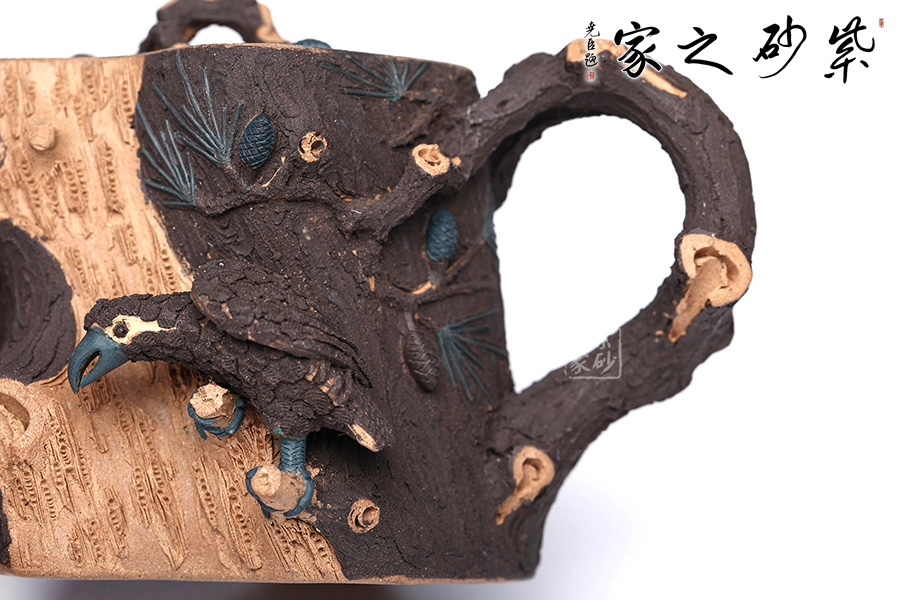 松鷹壺創(chuàng)作于80年代。身筒是一截老松樁,內(nèi)胎為段泥,表面用原礦紫泥堆砌出粗糙的表皮,形式十分逼真。仔細(xì)觀之,松針、松葉、松痂清晰可見,細(xì)節(jié)處理細(xì)致入微。一只蒼鷹腳踩松枝上,爪子鋒利有力,眼神目光如炬,栩栩如生。