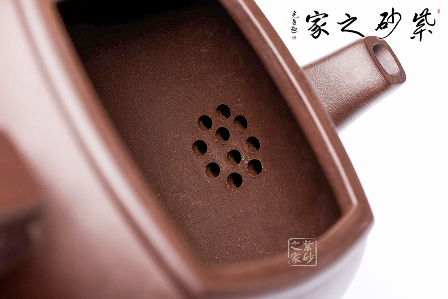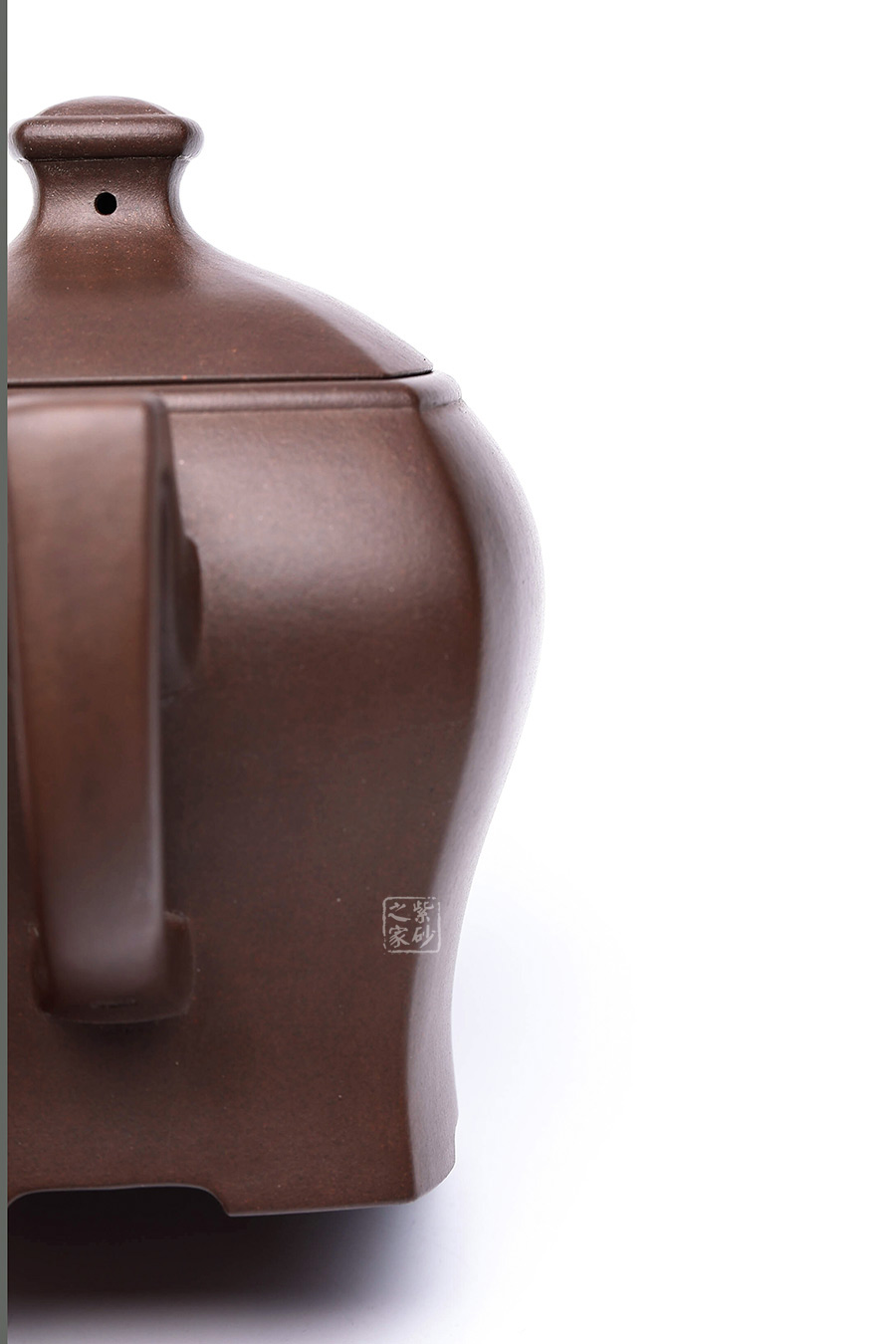 原礦紫泥制成的四方紫砂壺壺泥色低調沉穩(wěn),十分細膩。底承犴門,作高身四方體,身中略有凹陷。所有塊面轉折收斂,將直線與弧線巧妙結合,使之方中帶圓,創(chuàng)造了優(yōu)雅而悅目的造型。