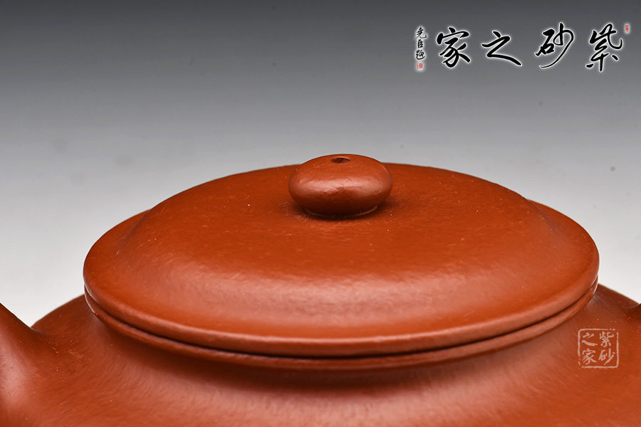 整壺壺體扁而不塌,制作難度較高。壺腹寬大,扁如玉璧,流、把舒展流暢,壺流自壺腹一彎而出,壺把自壺腹上彎至壺腹下端,與劍流相呼應(yīng),使得扁腹向左右延伸,有曲張之勢(shì)。壺肩平坦,蓋邊線略強(qiáng)于口線,正合國(guó)人天蓋地之理念。扁圓蓋,球形鈕,視覺觀感上佳。