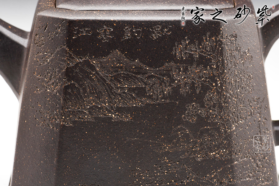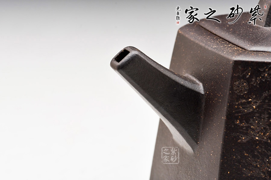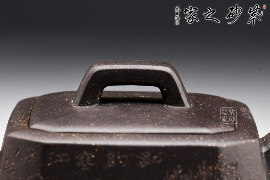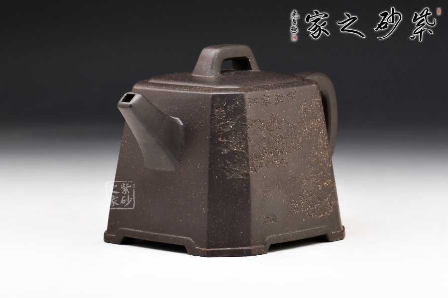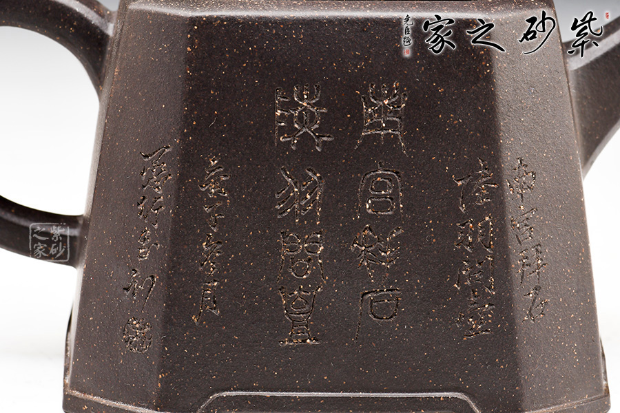 身體呈方壺之型,各部比例協(xié)調(diào)。線面挺括,輪廓分明。將直線與弧線巧妙結(jié)合,使壺方中帶圓,優(yōu)雅而悅目的造型給人古拙之感。