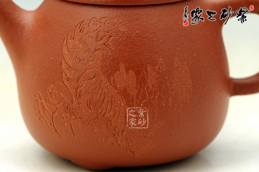 盧寧剛老師精于陶刻,此壺壺身正面篆刻的是“虎嘯深山圖”,一只猛虎傲立于群山之巔,一嘯震天地,頗有百獸之首的威風(fēng)和霸氣;壺身反面篆刻的是“雄風(fēng)”二字,也正是形容虎嘯深山的霸氣。