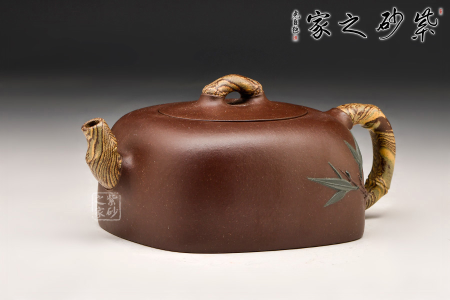 此壺做工精美,造型古雅,整壺比例協(xié)調(diào),線條流暢,圓中寓方,方中有圓,轉(zhuǎn)折合度。壺把、鈕、流,以絞泥技藝制成,借竹之元素,絞泥部位從連接處出,壺身飾以一枝竹,