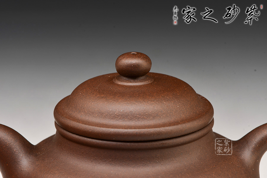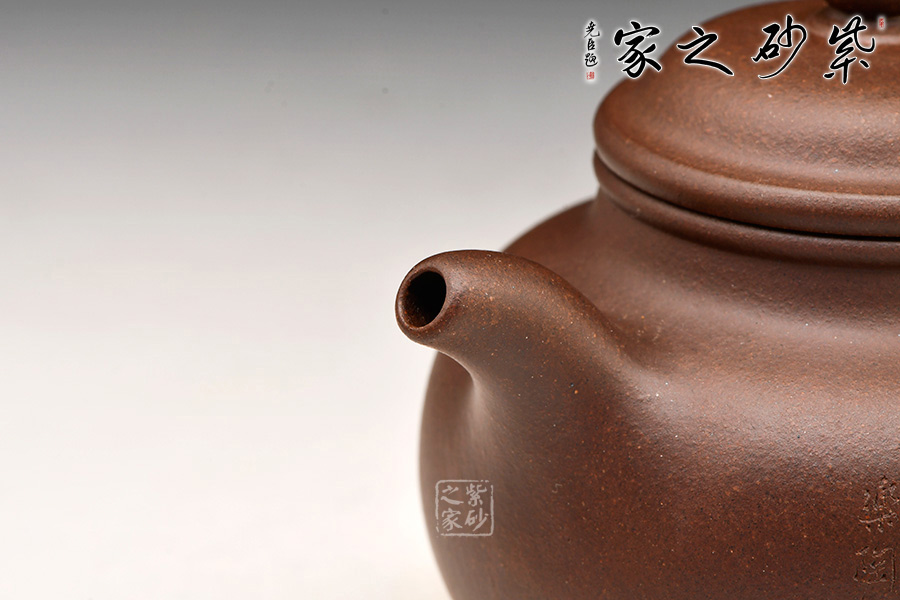 此壺有著渾圓的壺身,半圓的壺蓋,圓鈕,線條流暢,比例得當(dāng),壓蓋略微渾厚,點(diǎn)線之間見出魅力,子母線口蓋溫和嚴(yán)密,骨肉亭勻,簡練大方,制作頗見功力;彎流嘴胥出,在端頭下壓,柔美之姿明顯,壺柄略微上抬之后優(yōu)雅滑落而下, 形成一條圓潤飽滿的弧線,樸雅大方。