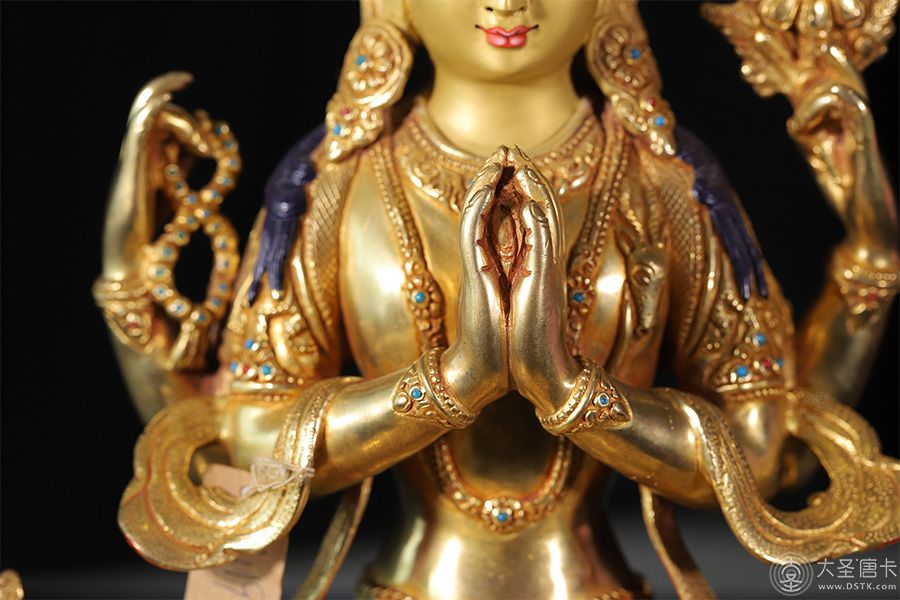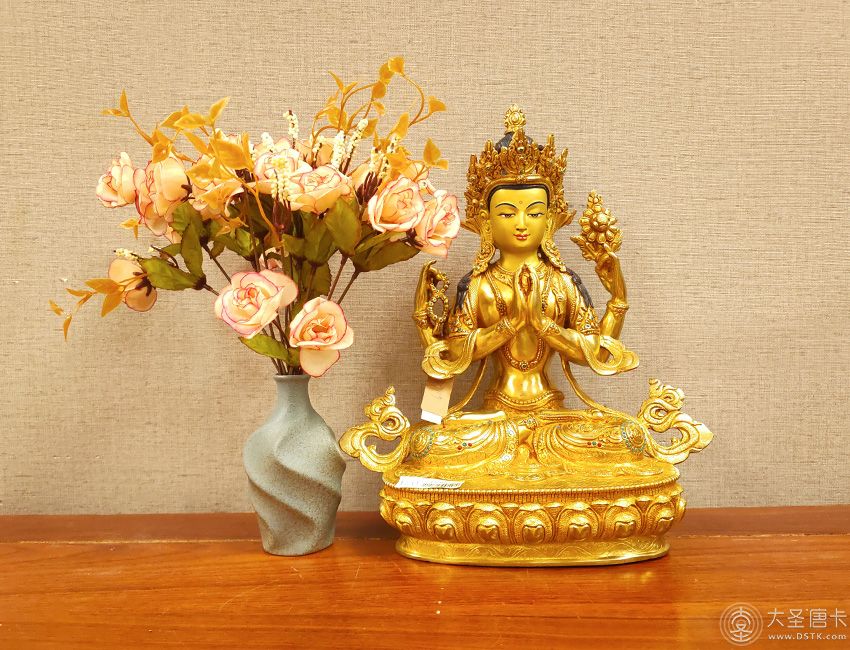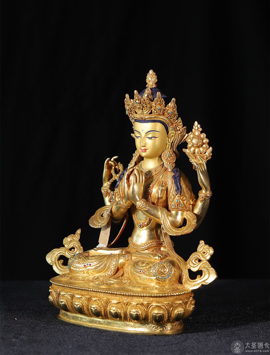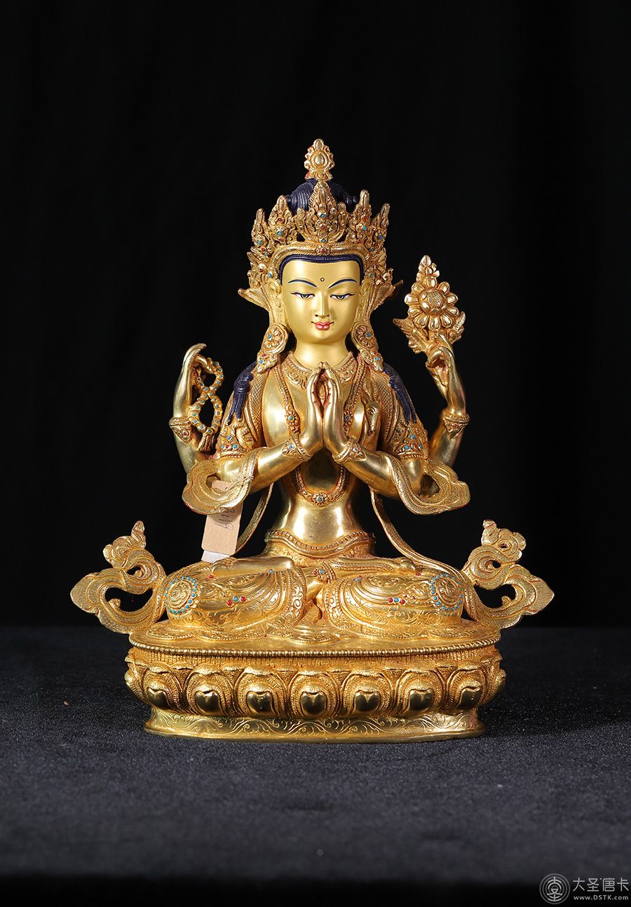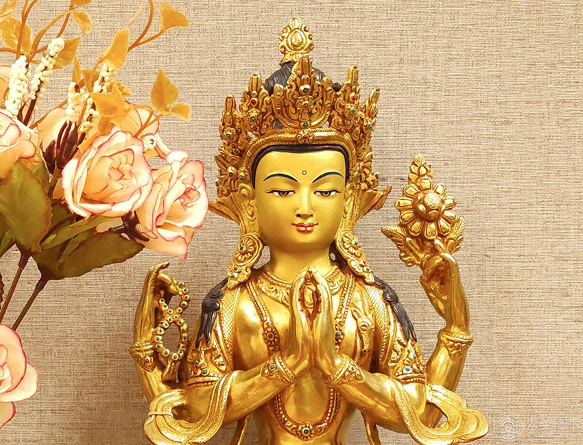 四臂觀音,雪域西藏的守護神,為西藏佛教密宗本尊之一。本尊身顏潔白如月,頭戴五佛冠,發黑色結髻,中央二手合掌於胸前,捧有摩尼寶珠,右手持水晶念珠。左手拈八瓣蓮花與耳際齊,面貌寂靜含笑。