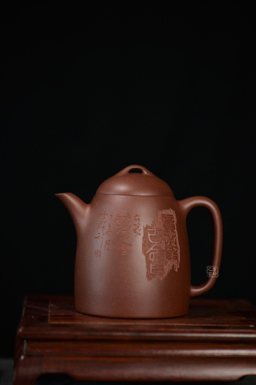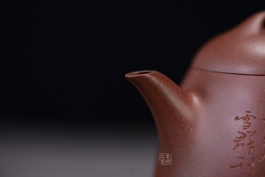 彎嘴出水利落,長耳把如佛耳,飄逸瀟灑;截蓋微鼓,橋型鈕,彎曲有度。
