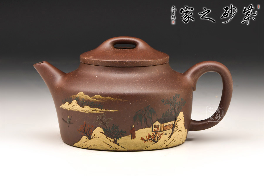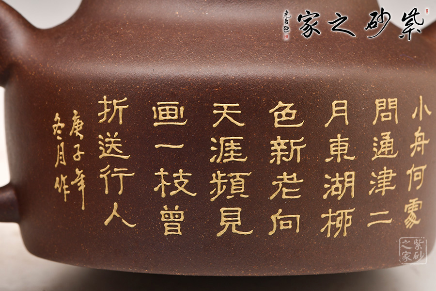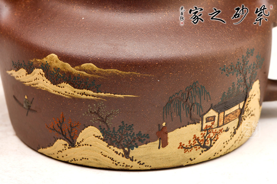 在泥繪漢韻壺的壺身兩面,一面以單色黃泥書元代吳志淳《題小山水景(二首)》通篇詩文,字體端莊文雅,落筆干凈順暢,布局整齊,美觀大方。另一面則依詩文內(nèi)容,繪出一幅氣韻高遠(yuǎn)的中國畫。畫面布局合理,將詩歌的意境淋漓盡致詮釋出來,賦予了作品獨(dú)到的人文意蘊(yùn)。