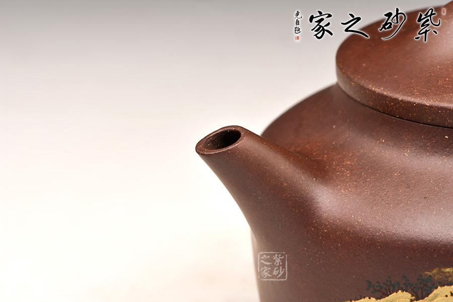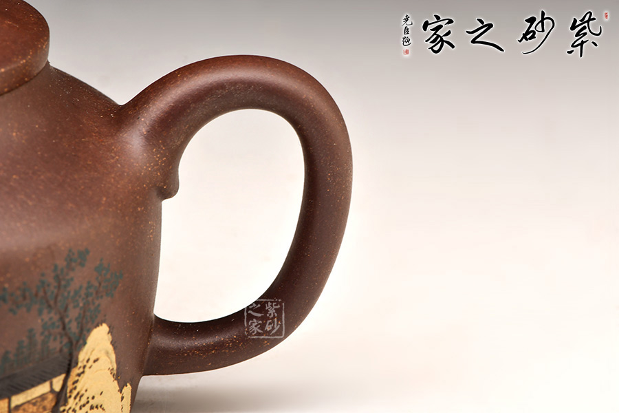 泥繪漢韻壺壺身圓潤高挺,飽滿豐腴,氣度極佳,制作精良嚴(yán)謹(jǐn),線條挺拔流暢。頸直與壺肩圓渾相適,平整吻合,壺嘴作直流式,胥出自然,壺把曲中帶方,婉轉(zhuǎn)自如,統(tǒng)一而和諧。