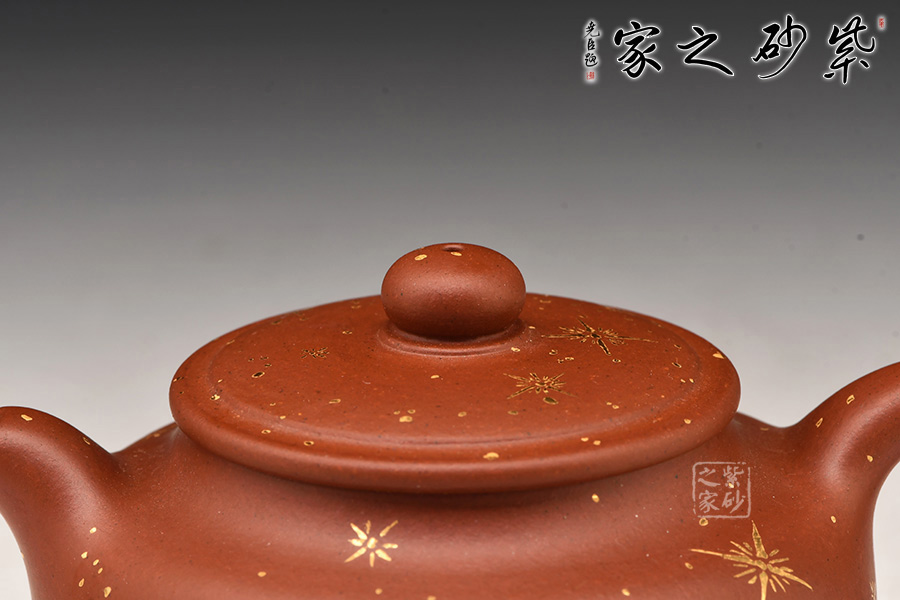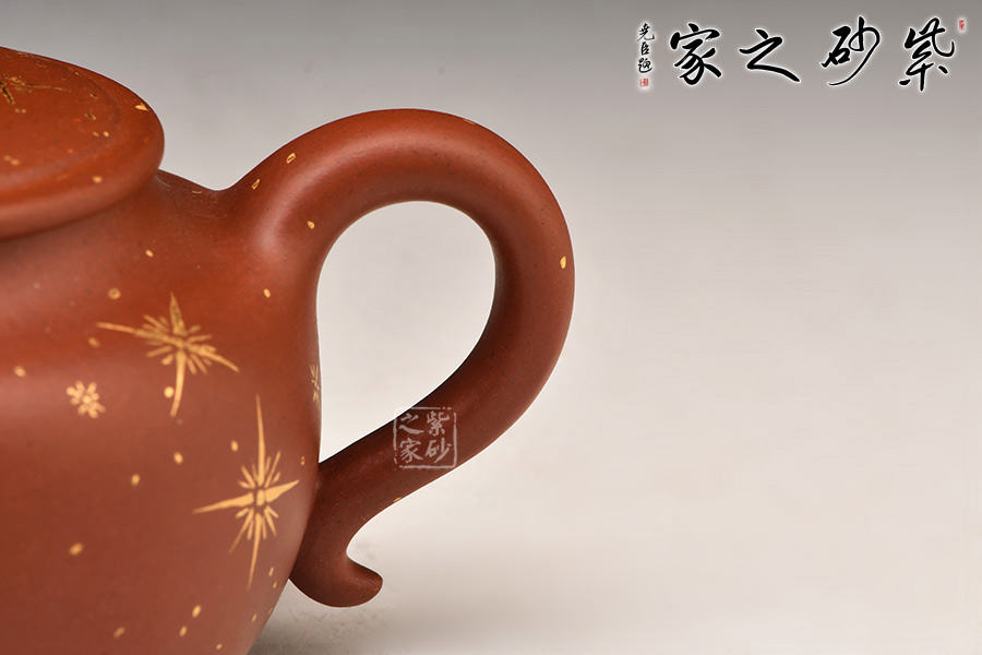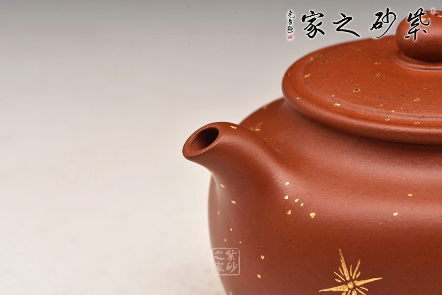 壺身為蓮子形,寶珠鈕,一彎流,平蓋協(xié)調(diào)而雅致,素雅的壺身將紫砂壺典雅古樸的氣質(zhì)巧妙體現(xiàn),壺身的描金恰似午后的陽(yáng)光照在蓮子之上,讓人身臨其境
