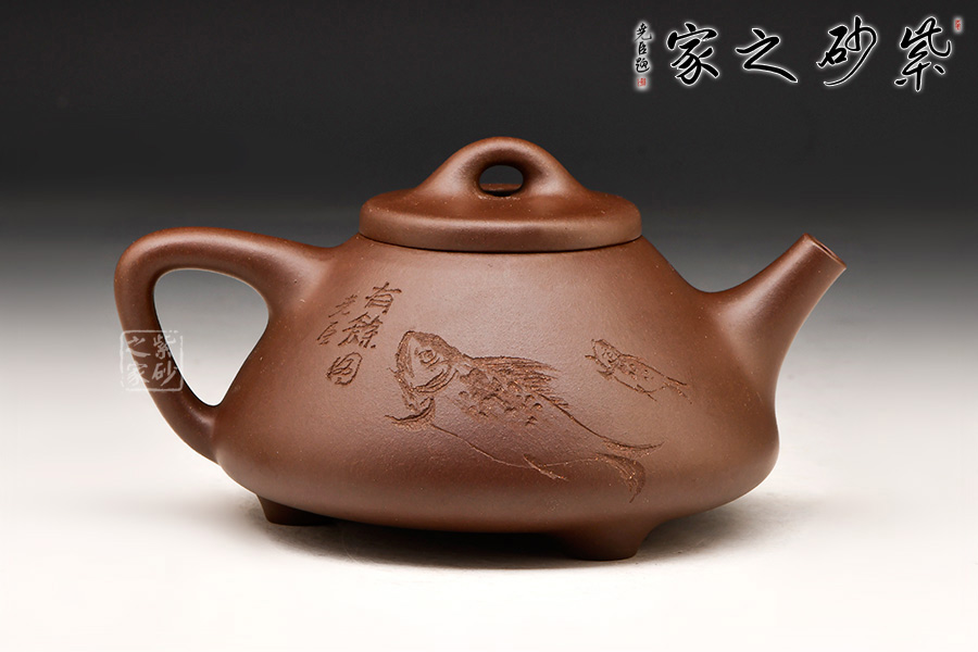 壺嘴平直,出水流暢;蓋平直,拱橋紐;壺把采用倒三角形,三尖足。壺身裝飾有魚(yú)形圖案,圖案惟妙惟肖,是難得的佳作,收藏自用皆宜。