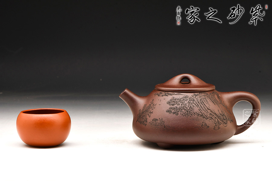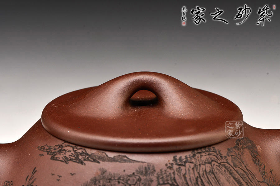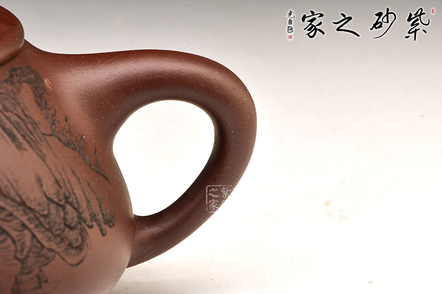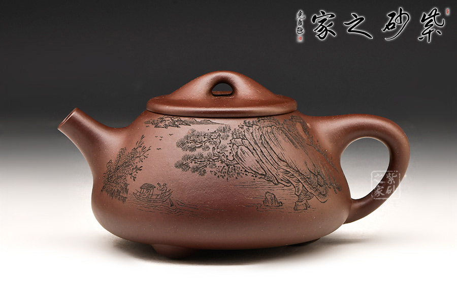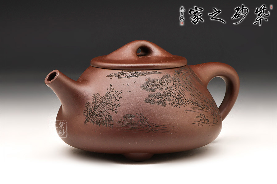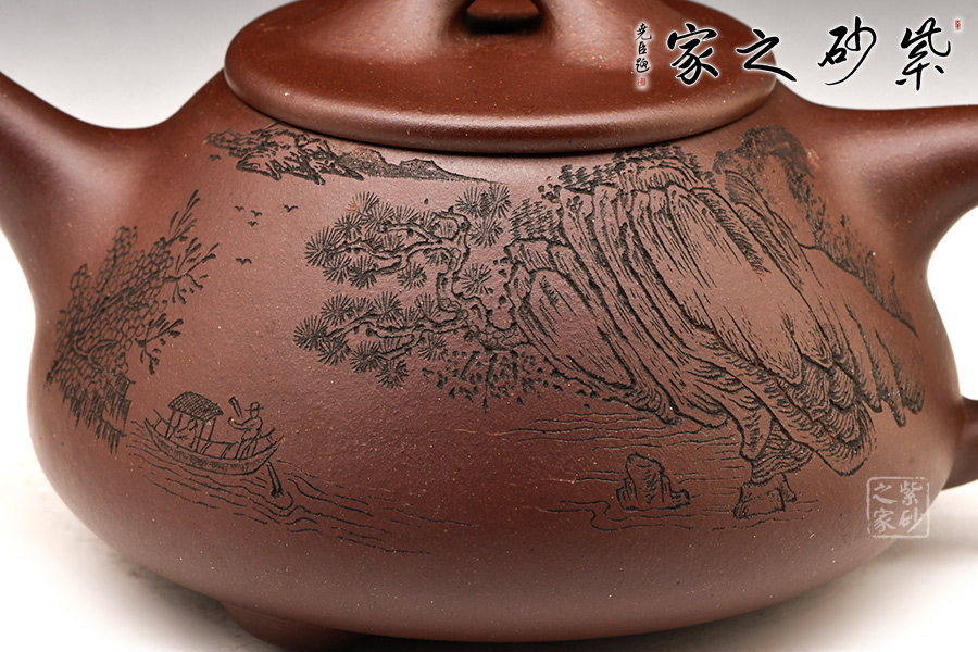 景舟石瓢 ,紫砂泰斗顧景舟大師所創(chuàng)經(jīng)典壺型。濮晨老師選用原礦紫泥繪制經(jīng)典壺型,輔以山水舟林點(diǎn)綴作品。