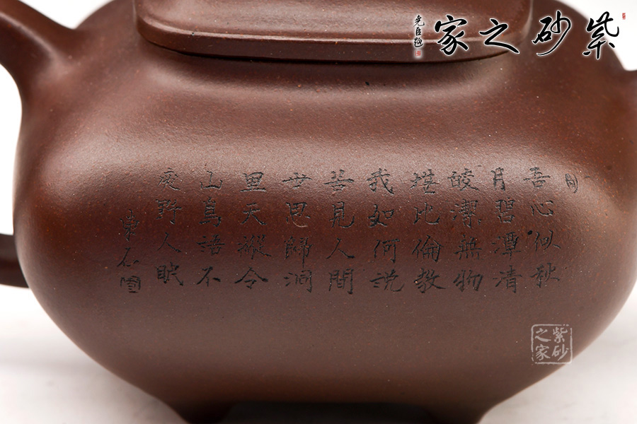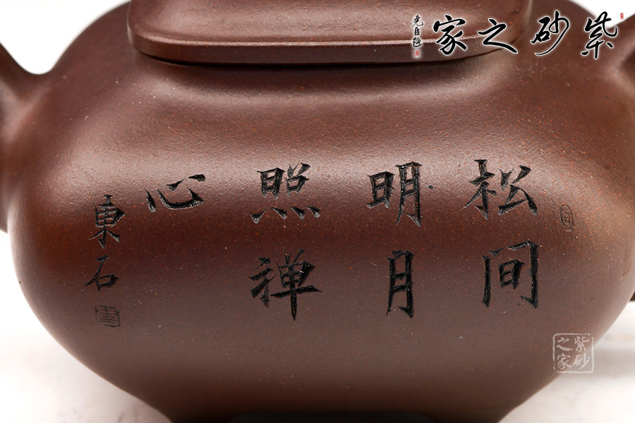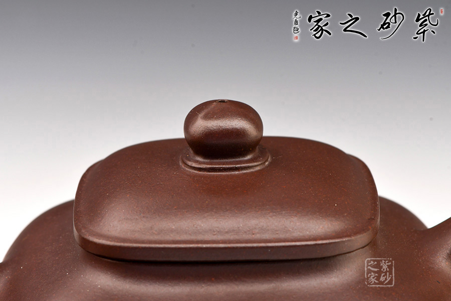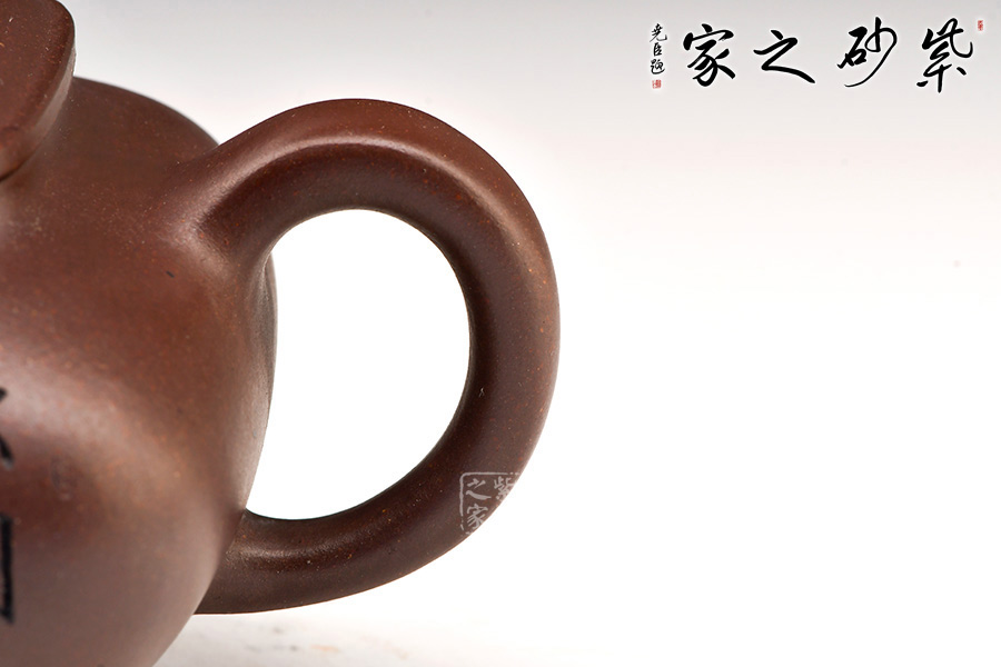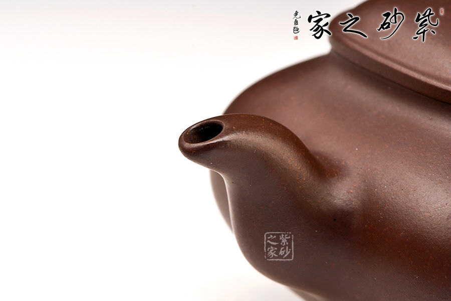 該壺型仿若一個香爐,壺身骨肉亭勻,輪廓清晰,線條流暢,過渡自然。壺嘴呈彎流狀蜿蜒而上,優(yōu)雅自然,出水爽利,收水干凈;耳形壺把端莊自然,端握舒適;壓蓋扁珠鈕,經(jīng)典大氣。
